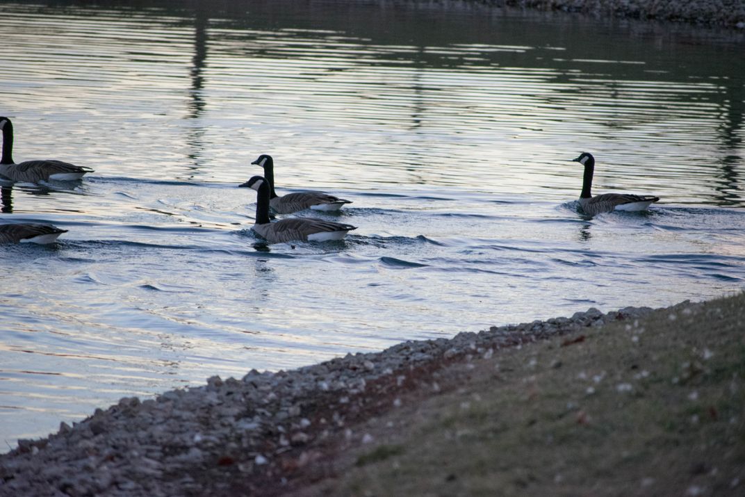 Geese floating gently on in the pond