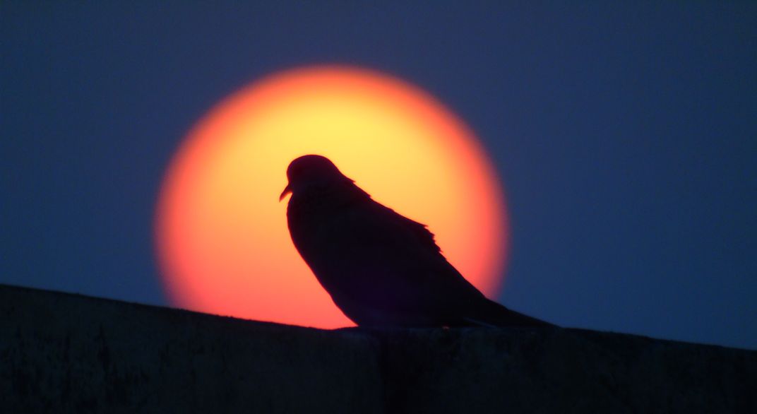 The bird sitting on the wall of the temple is saluting the setting sun.