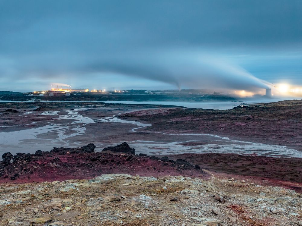 A view of the Reykjanes Power Plant in Iceland at dusk with natural geothermal activity in the foreground.