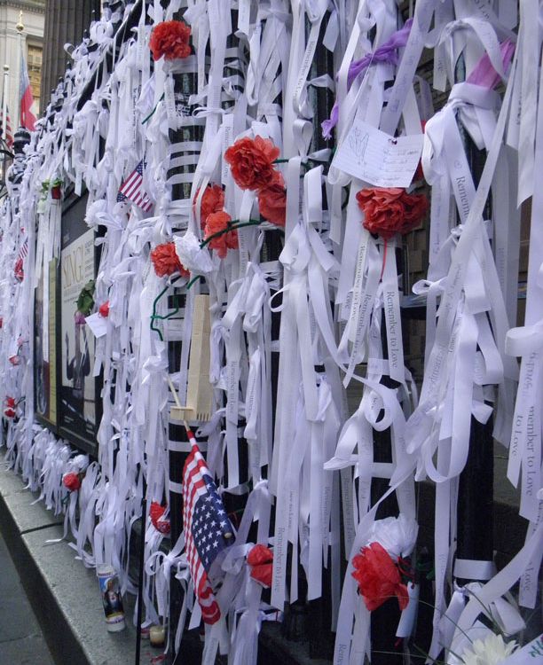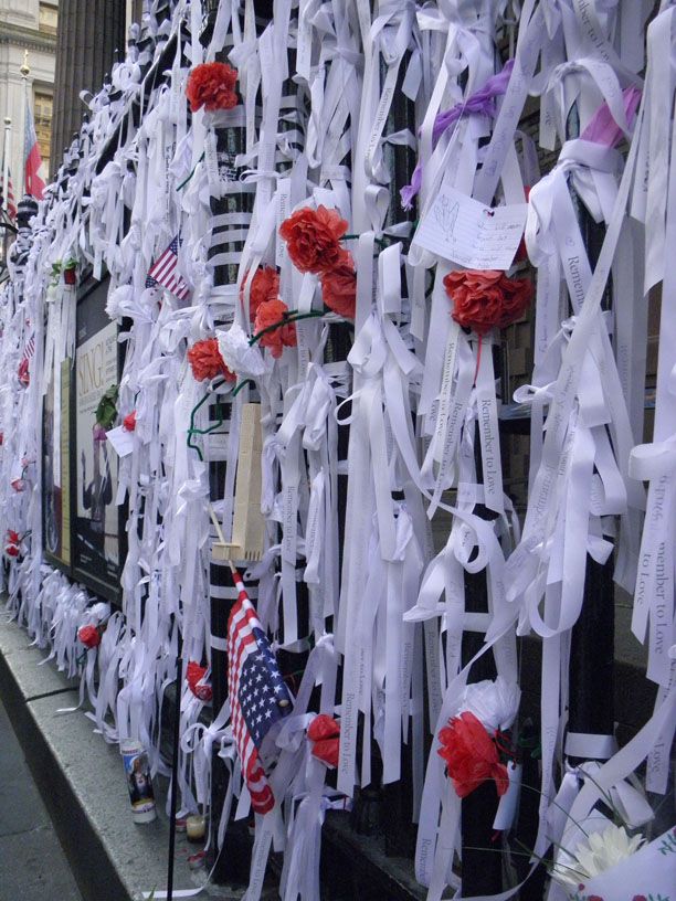 Ribbons signed and hung in tribute to the fallen of 9/11 outside St. Paul's Church in New York.