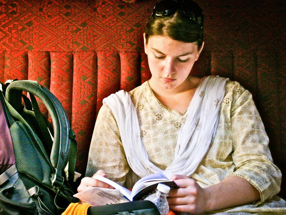 Riding on the train from New Delhi to Varanasi, India, enjoying the long ride.