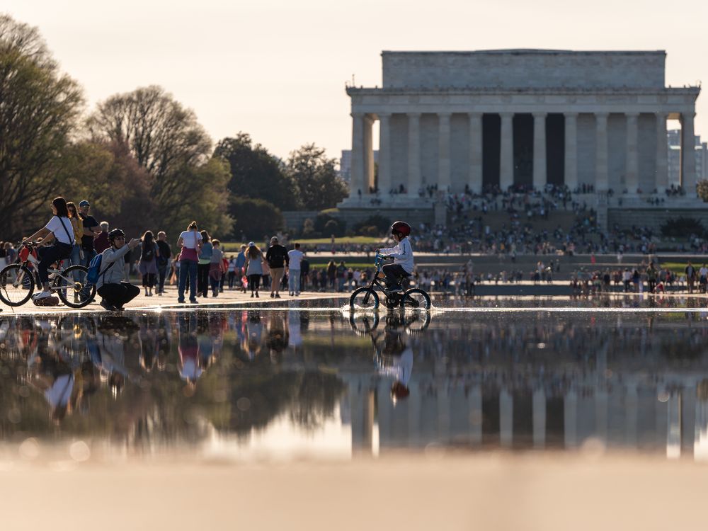 During cherry blossom peak bloom, the reflecting pool at the Lincoln Memorial was partially drained for its annual cleaning, leaving a thin layer of water across the basin. When a child biked through the shallow reflection, it created a rare and playful moment against one of D.C.’s most iconic backdrops.
