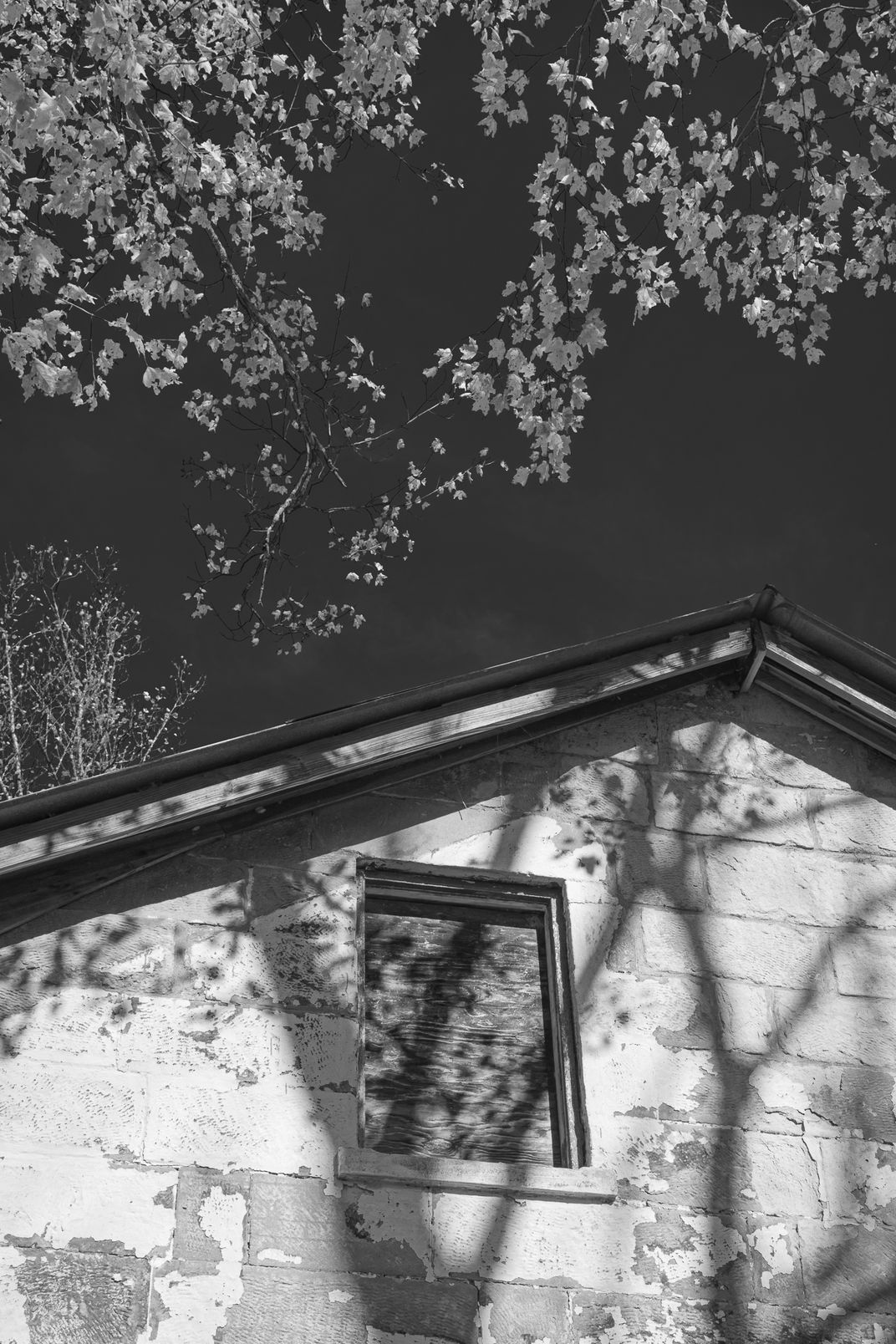 Ring Mill House, 1800s home on Ohio Covered Bridge Scenic Byway and National Register of Historic Places, autumn portrait with foliage and shadows under deep blue sky. Grayscale conversion.