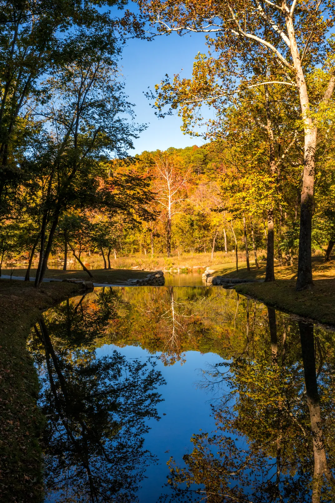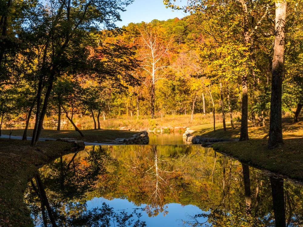 A reflection of a tree on the back side of a small water fall over a pathway. While walking the trails of Doywood Canyon in Missouri, I found an area of water that was reflecting the fall trees.
