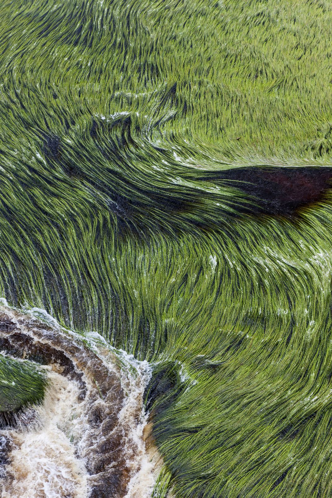 The grasses growing within the river of the amazon sway to the flow of the water.