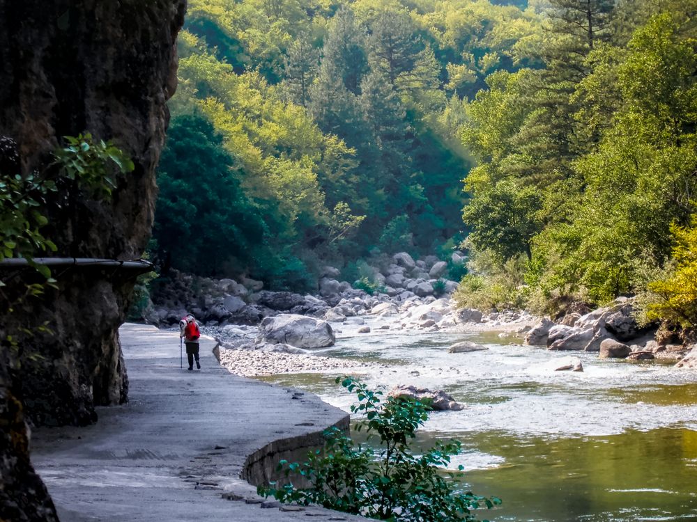A lone hiker follows the narrow path carved beside the Awos River, surrounded by dense forest and morning light. The scene captures the quiet rhythm between human movement and the wild landscape.
