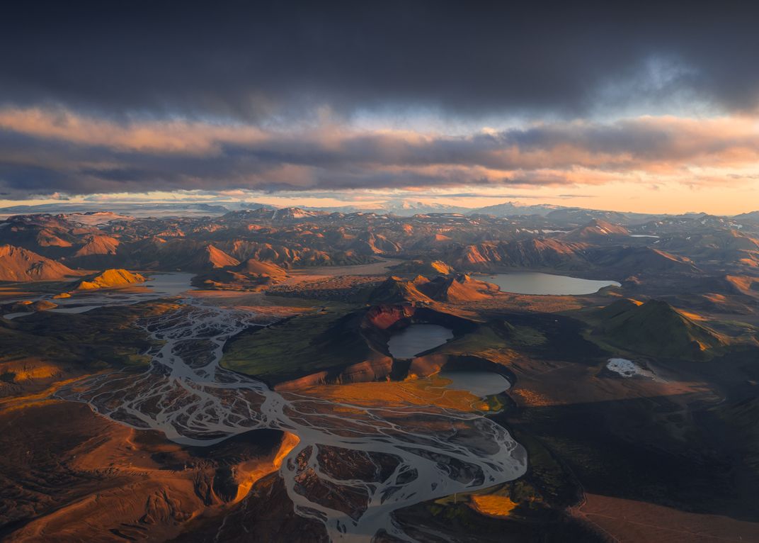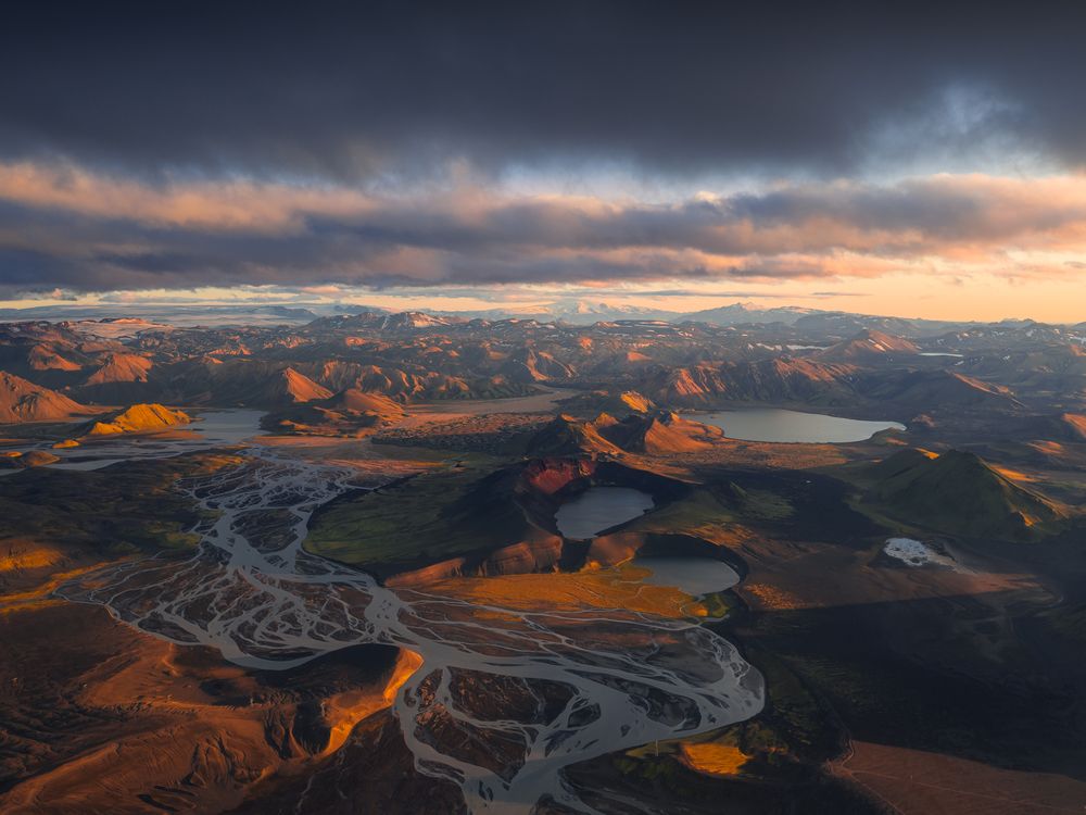 A drone view of Iceland’s Highlands at sunset reveals braided rivers winding through volcanic terrain. Warm light ignites the mountains and craters, contrasting with the cool glacial waters and creating a dramatic, otherworldly landscape.