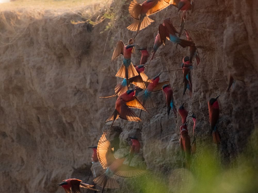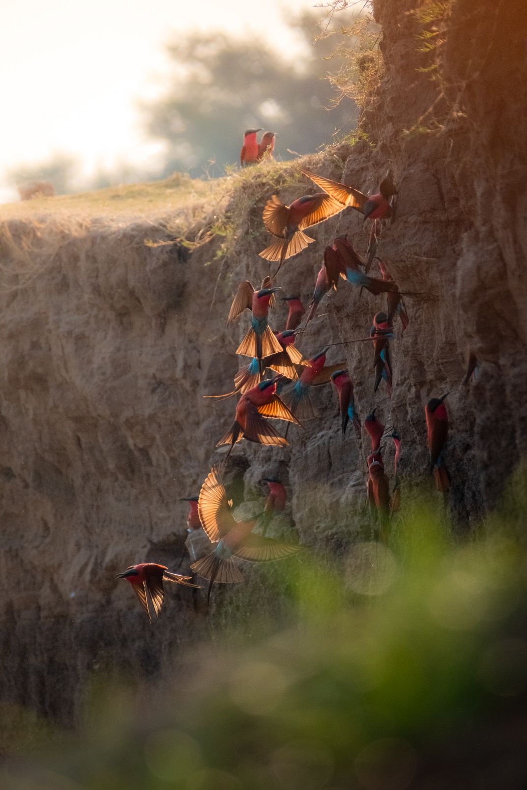 A number of Carmine Bee Eaters finding food on the riverbank of the Luangwa River in Zambia.