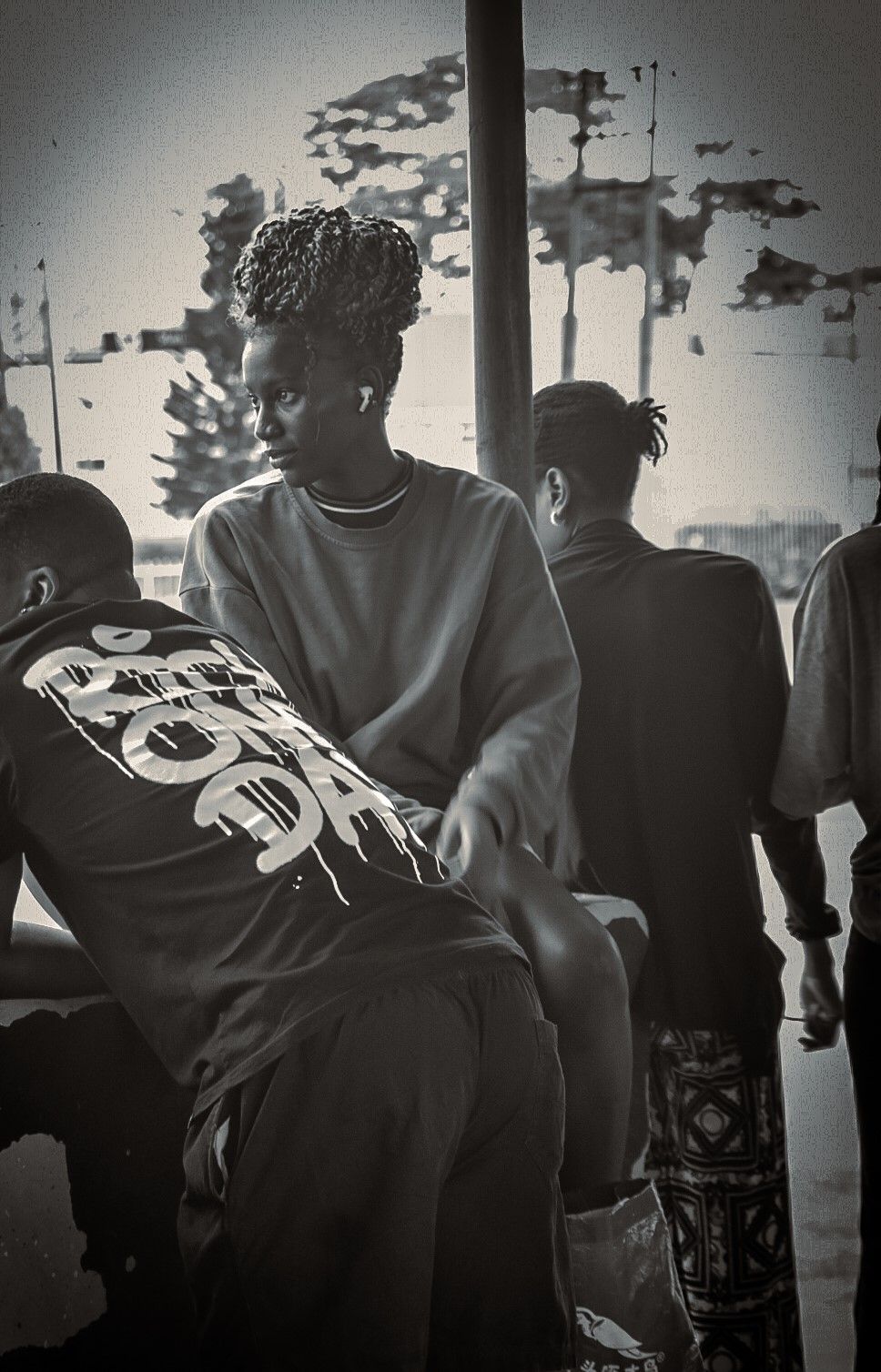 While some joked and others planned, some travelers drifted into quiet contemplation. Sitting on the barrier of the highway, she looks away from the broken bus, lost in thought. A moment of solitude amidst the collective experience of the delay.