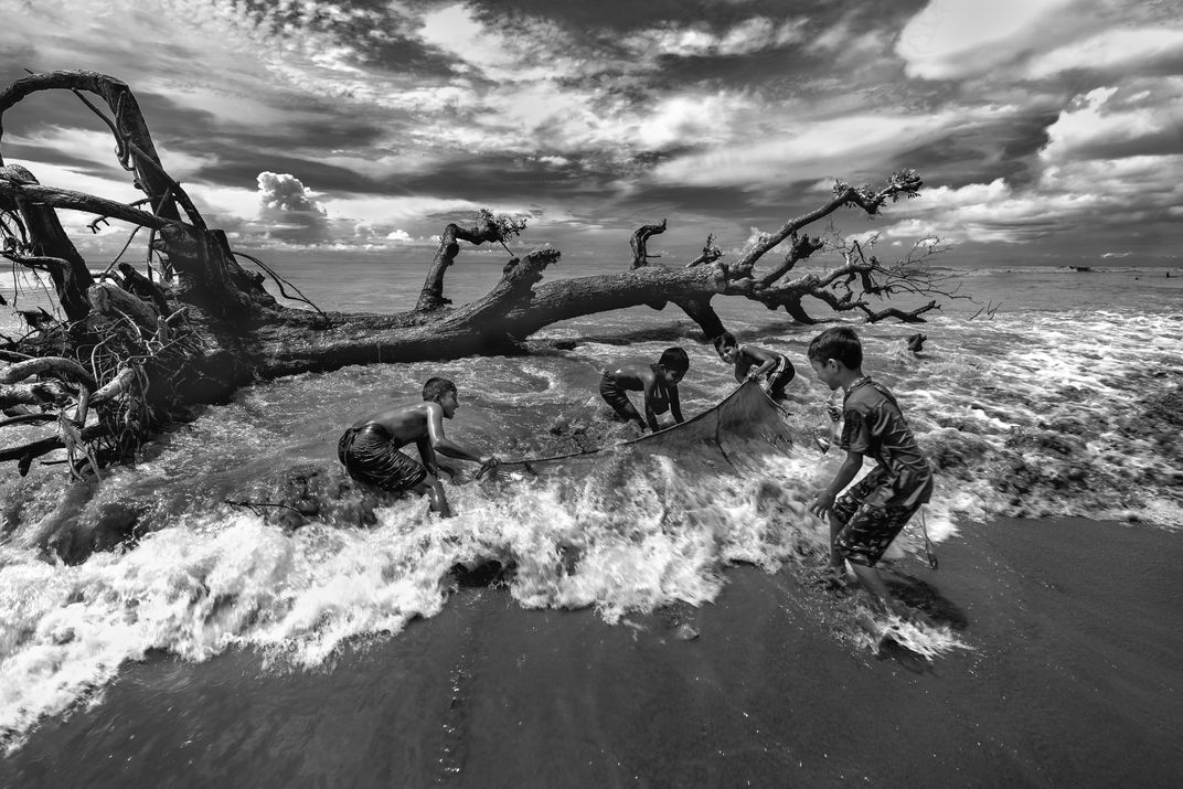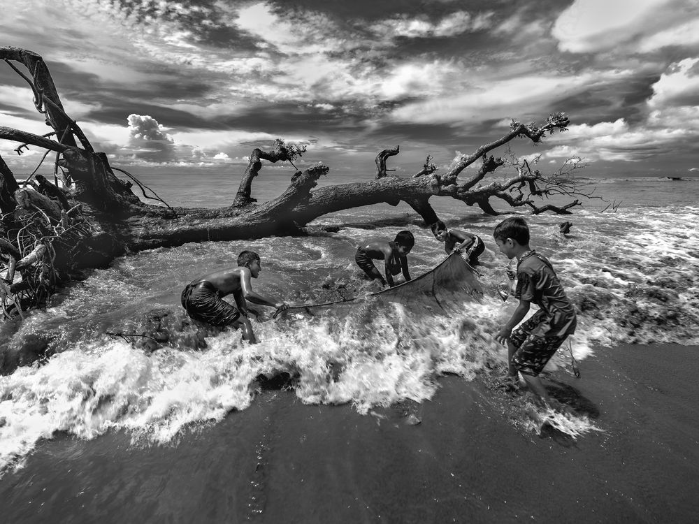 During monsoons' fury in Bangladesh, the Bay of Bengal thrashes like a wild lover, beautiful and brutal. Boys in Kuakata, united by dreams, cast their net into its chaos, where a fallen tree whispers of rising tides and vanishing forests. Fish shimmer in their hands, laughter spills out defiant and bright. Joy blooms briefly, while climate change creeps forward, silent and unseen, beneath their hope.