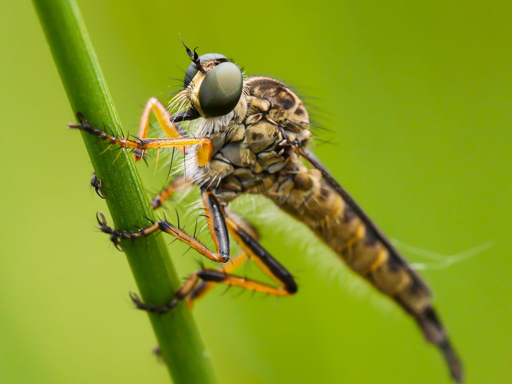The slender robber fly sitting on the reed grass, capturing it's unique shape and mosaic eyes.