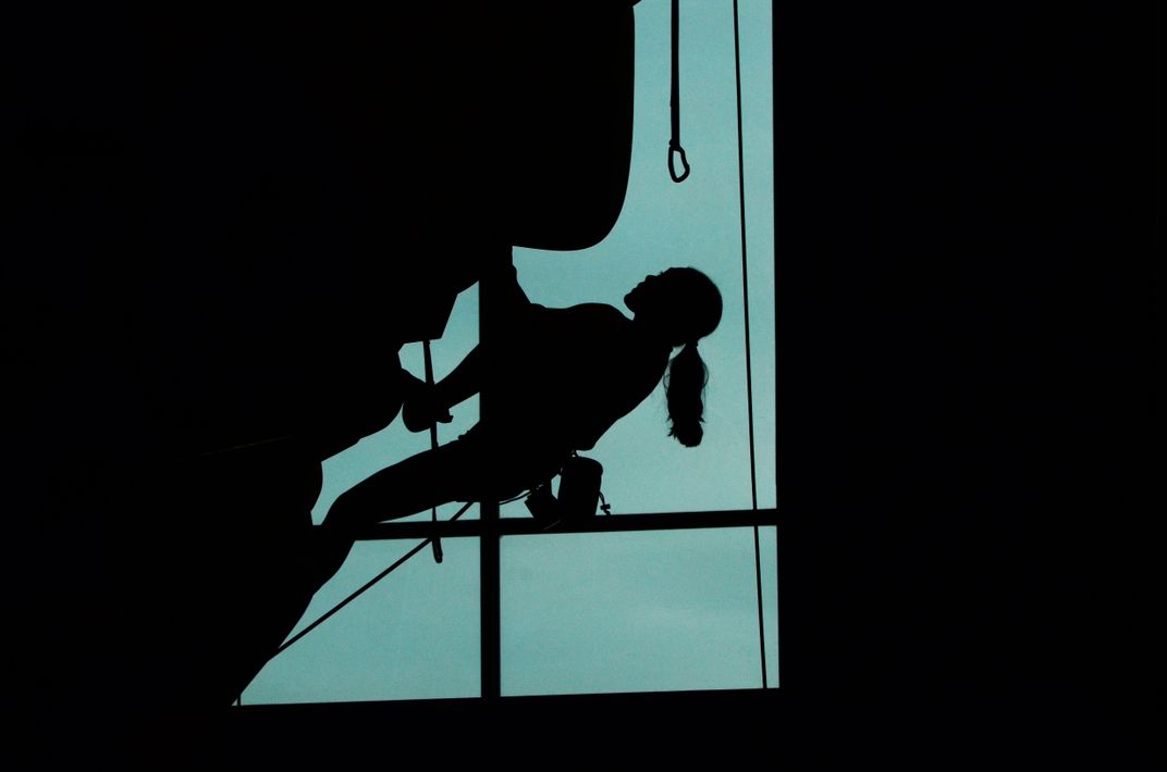 Rock climber Kayala Lucas competing in a rock climbing competition in Austin, Texas.