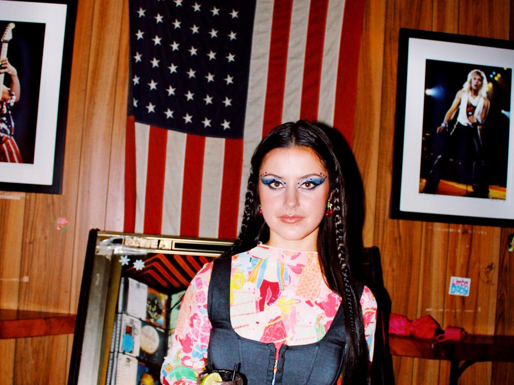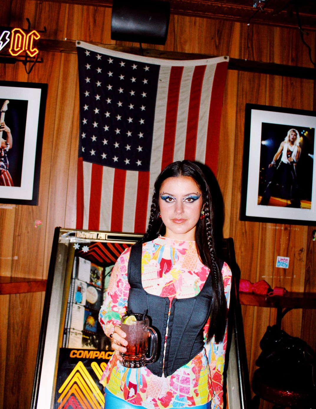 This image captures the dissonance of womanhood in contemporary America. Framed by an American flag and bathed in the glow of the jukebox, the subject sits between icon and contradiction, the past and the present. She is the quintessential young American woman both poised and uncertain, but also defiant and symbolic. This portrait plays with Americana as the backdrop, asking the questions of who gets to belong, who gets to pose, and who has to pose. What do we choose to celebrate in a country where identity and freedom have looked different in every generation?
