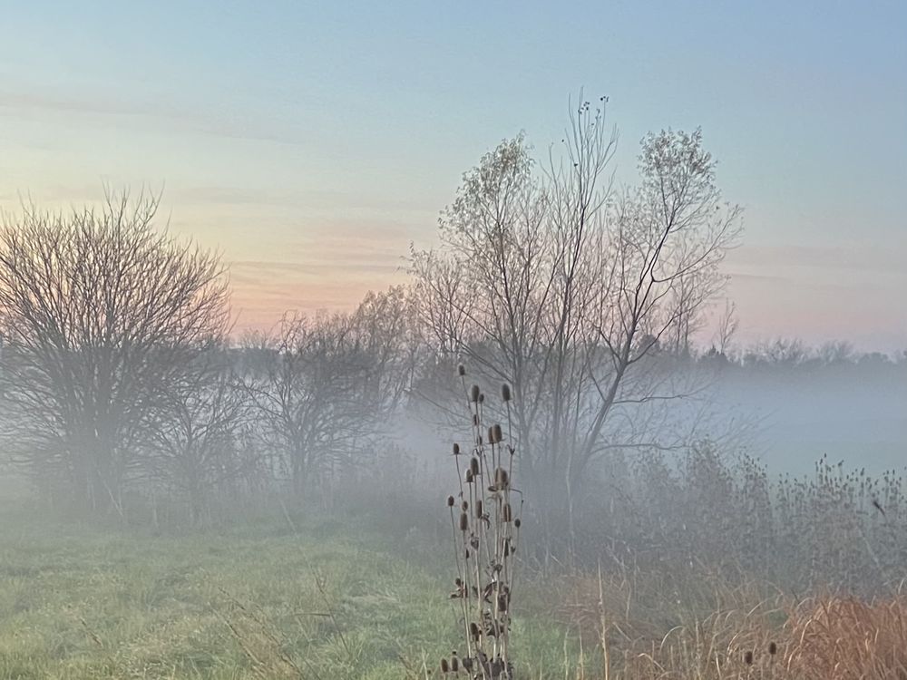 Stillness in the morning , serenity, peace. As the fog was moving in through the field.