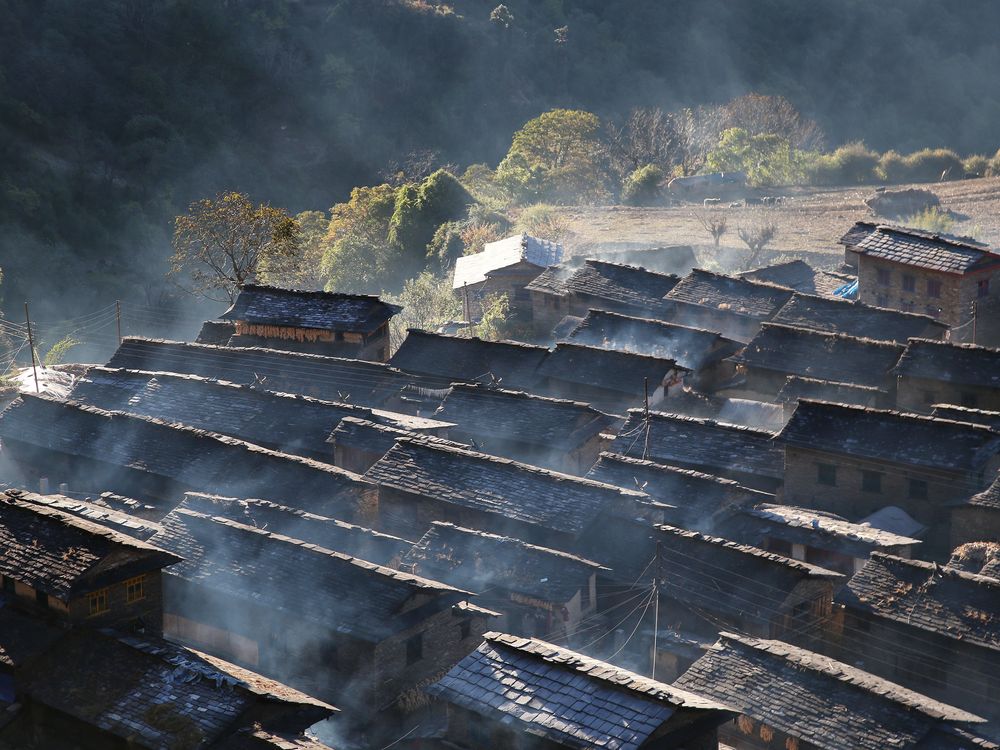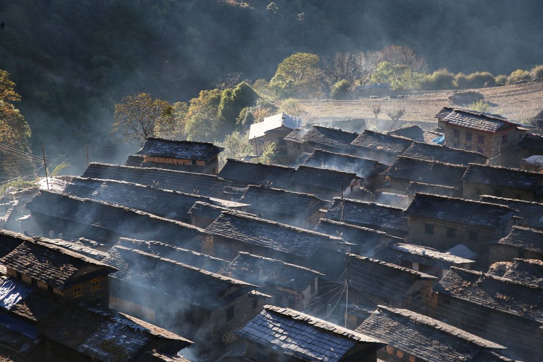 Gurja Khani, view from above. Gurja Khani is a predominantly Chhantyal village located in a secluded valley at the foot of Gurja Himal range, separated by mountain passes from the rest of the world, and only accessible on foot. Its isolation has allowed it to preserve total authenticity. While electricity and mobile connection are already available in Gurja Khani, not a single ancient house has so far been replaced with a modern structure.