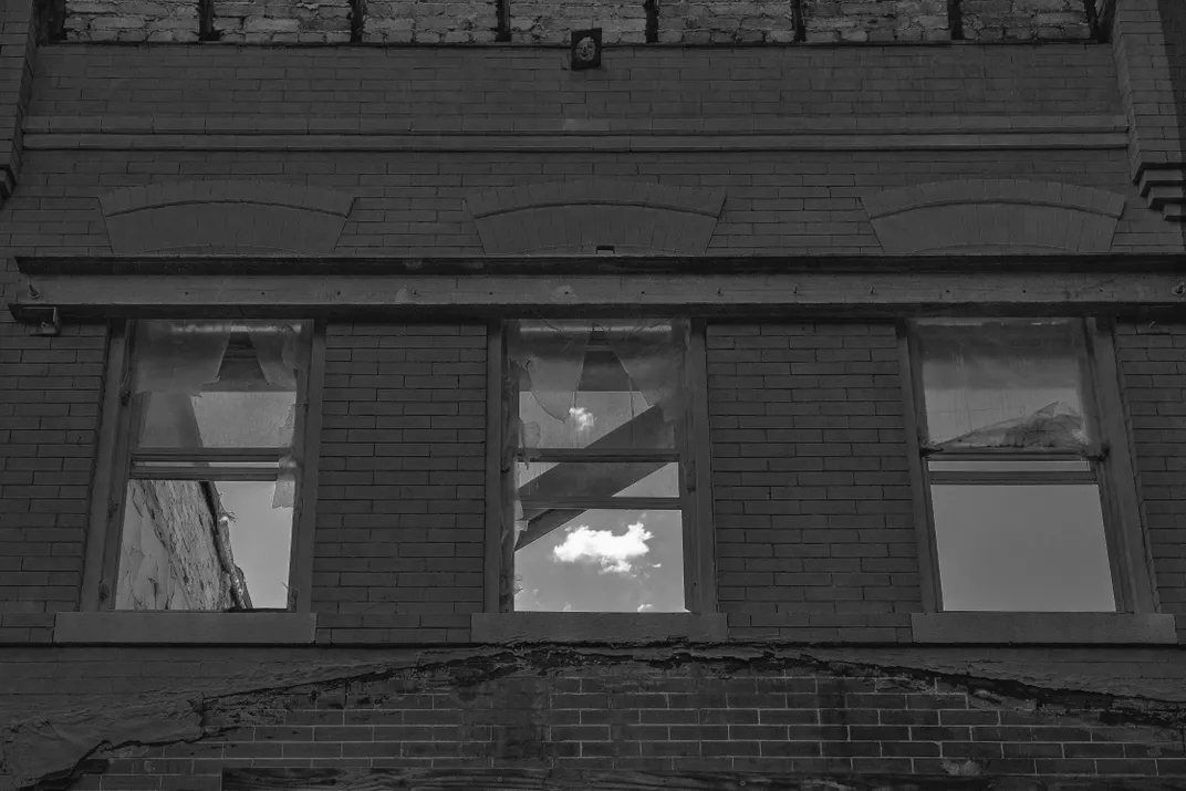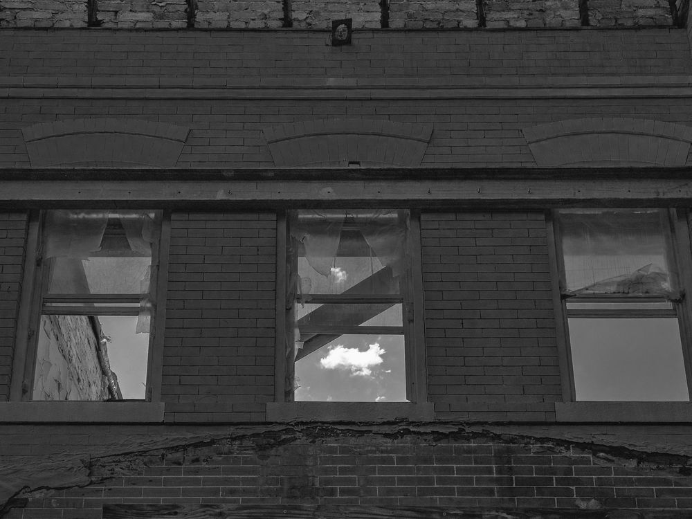 The view of a cloud, as seen through the facade window of a building currently being demolished.