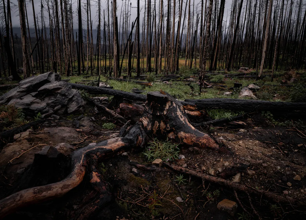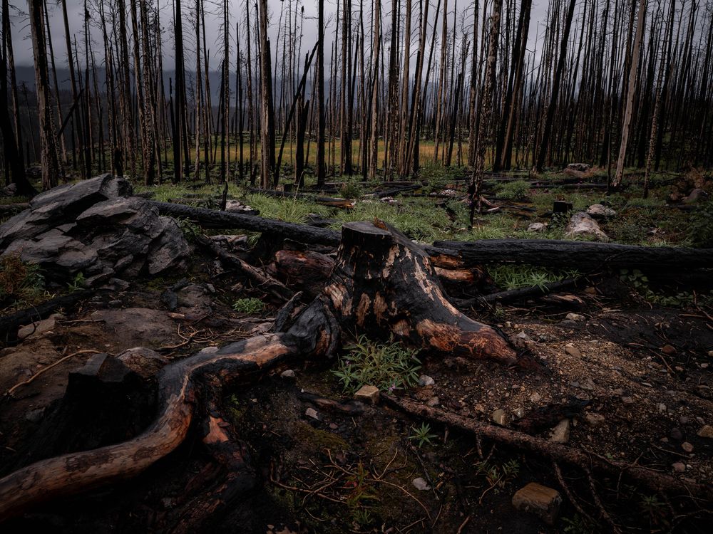 In a forest turned to ash, exposed roots and blackened trees stand as reminders of loss, while new shoots and grass emerge. This scene reflects the quiet strength of the earth pushing life forward after devastation.