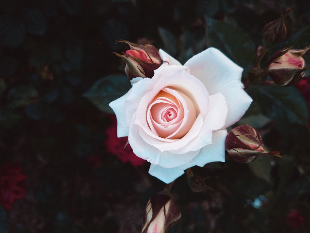 This close-up image captures a pale pink rose in full bloom, its delicate petals unfolding in a graceful spiral surrounded by tightly closed rosebuds. The soft elegance of the central flower contrasts beautifully with the dark, blurred background, drawing the eye to its intricate texture and gentle hue. The composition evokes a quiet moment of natural beauty, poised between emergence and stillness.
