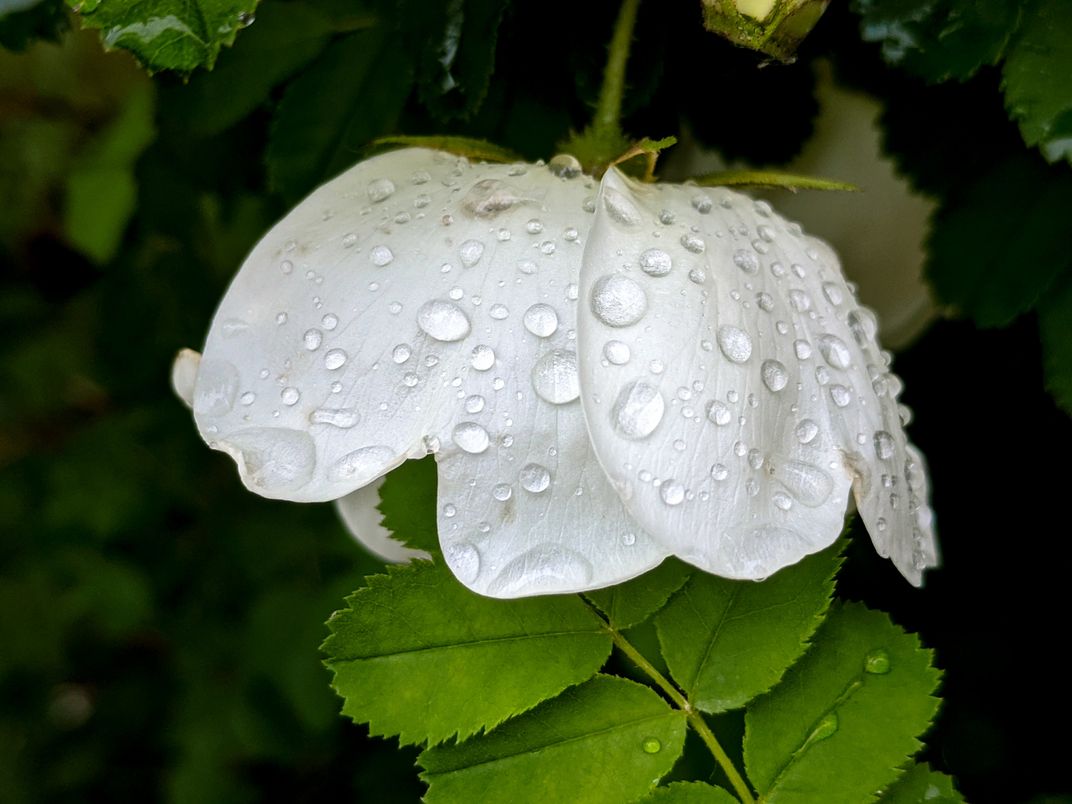 This image seems to have captured a dear moment of a white rose sheltering leaves from rain with a warm hug.