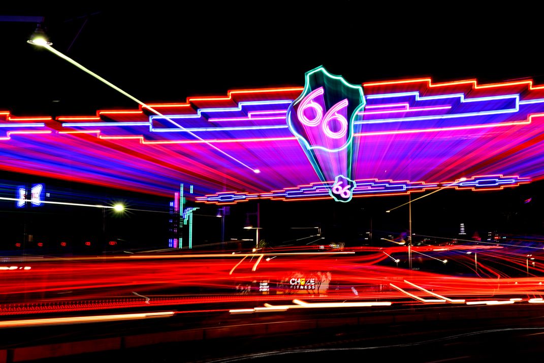 An iconic neon Route 66 sign spans over the bridge in downtown Albuquerque New Mexico. Photo is an 8 second long exposure employing zoom start/stop during exposure that accentuates the energy, motion and color of old Ropute 66.