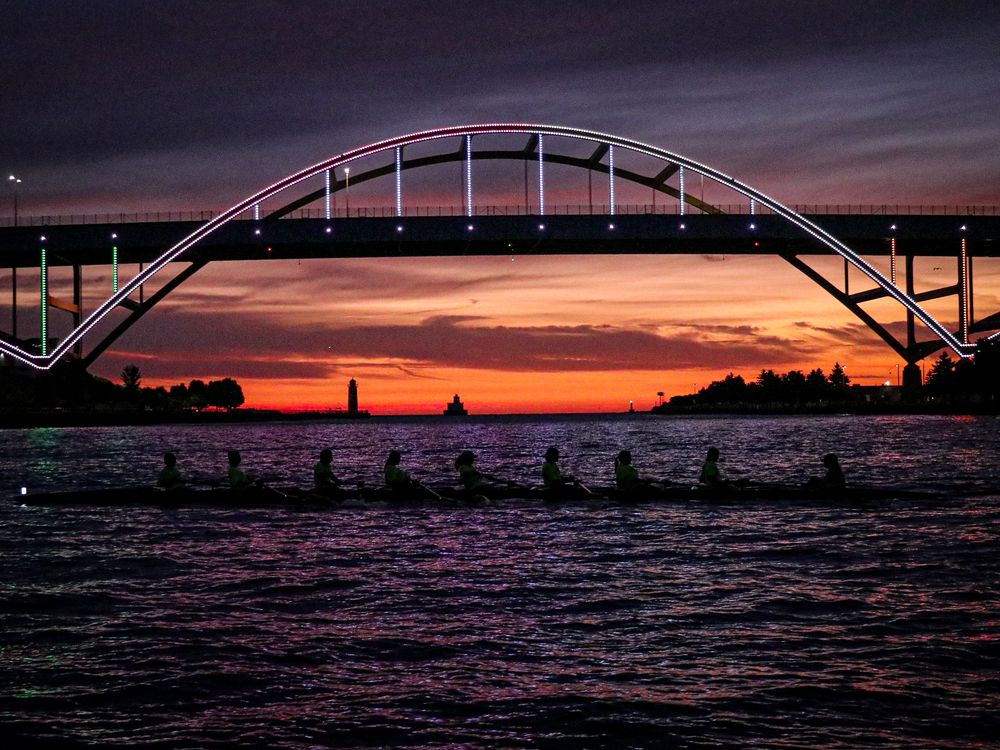 Milwaukee School of Engineering Women's Rowing team practicing on the Milwaukee River at sunrise. The boat is gliding under the iconic Hoan Bridge.