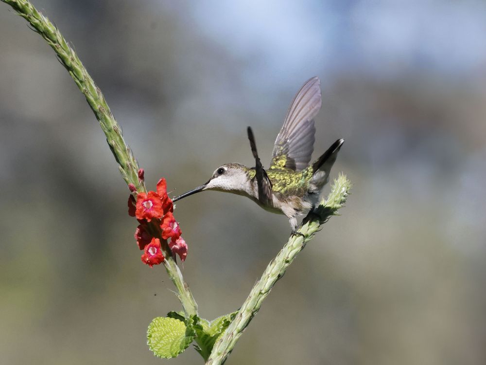 Every winter we have a little family of Ruby-throated hummingbirds consisting of the two parents and two offspring, who overwinter in our yard. I believe this was the little mom hummer feasting on the Coral Porterweed flowers.