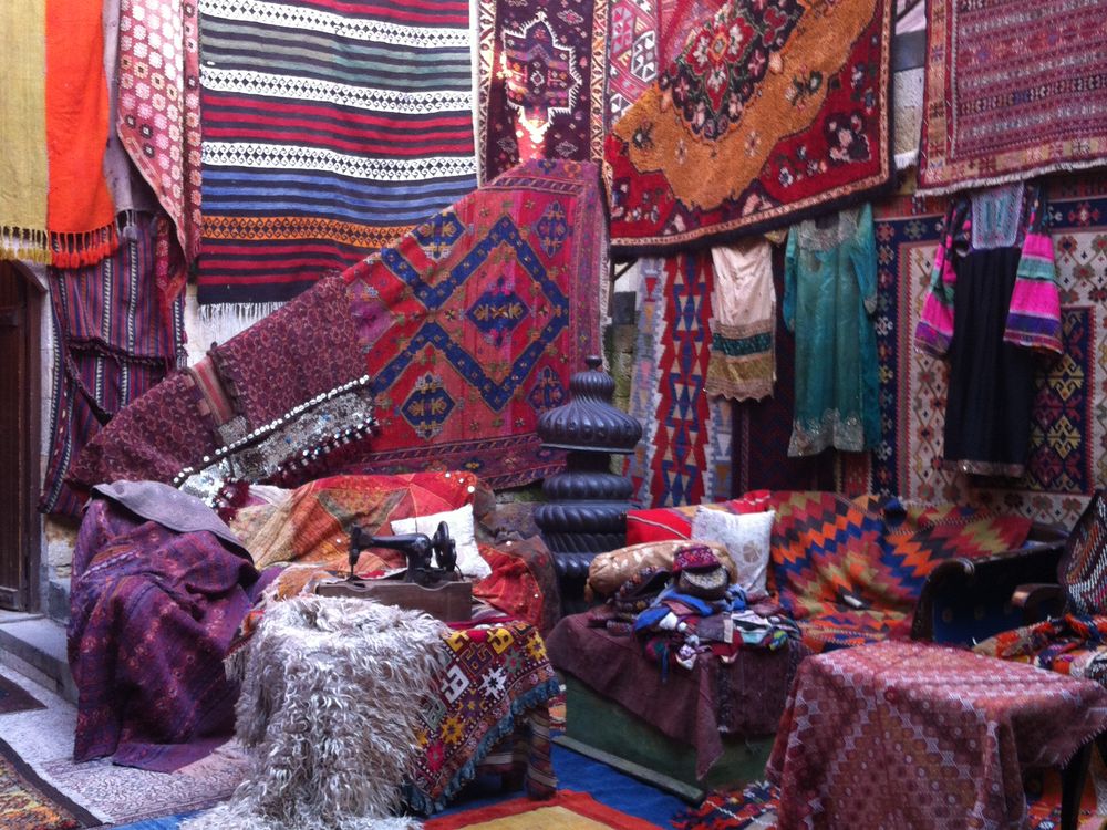 This is the inside of a rug shop in Turkey, with original, beautiful hand-made rugs spread everywhere