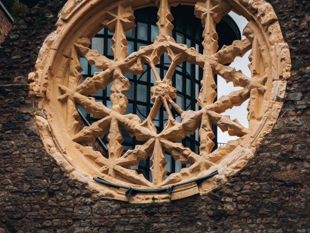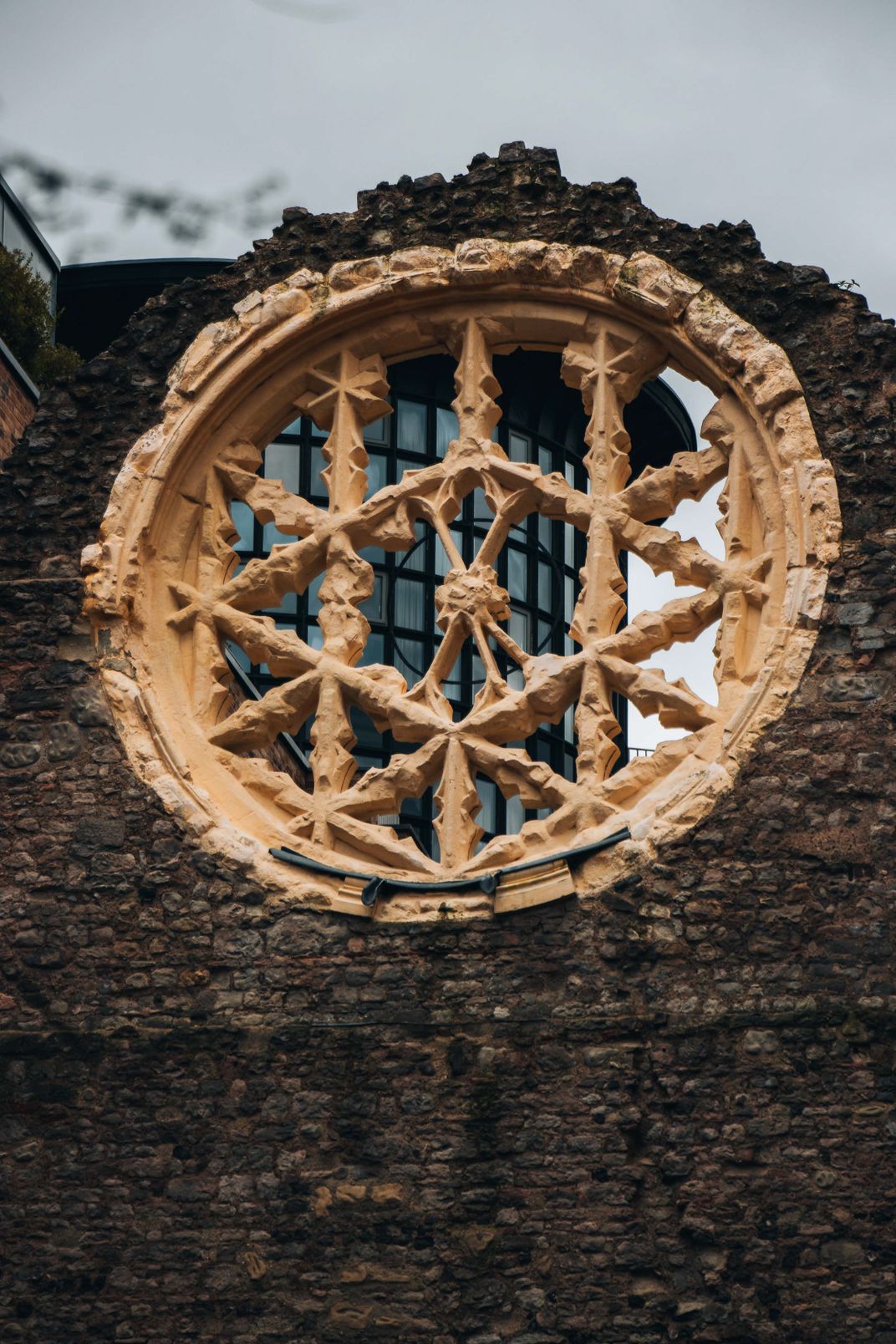 A silent trace of a church forgotten by time, standing in stark contrast with the glimpses of modernity seen through it.