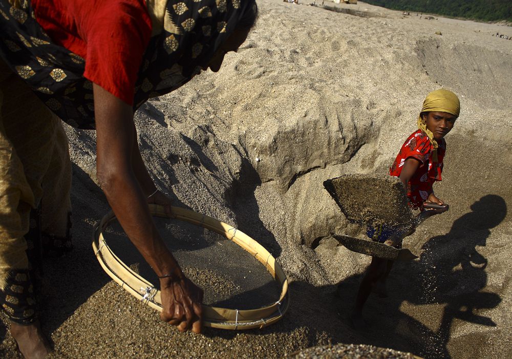Ruma(12) and her grandma work together to separate sand and stone from the banks of Piyain river. Jaflong, Bangladesh
