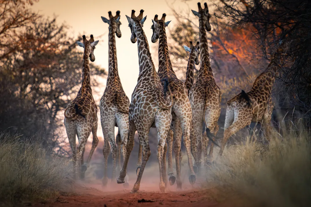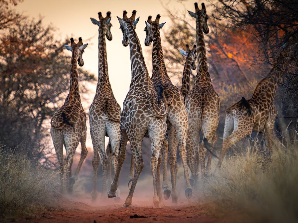 After several minutes of the entire giraffe herd staring me down as I knelt in the red earth to capture them from a low angle, they suddenly took off—moving in their strange, slow-motion gallop. A flurry of dust and rectangle-shaped fur filled the air, and within moments, they were gone in the bush.
