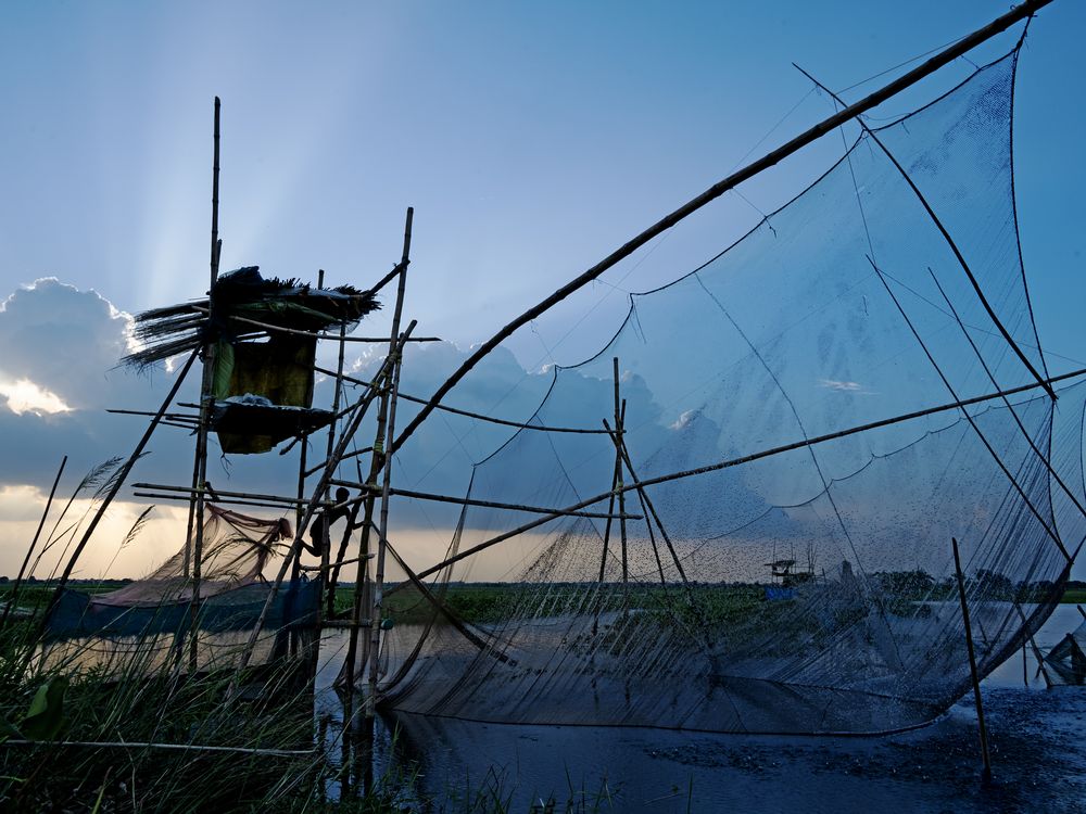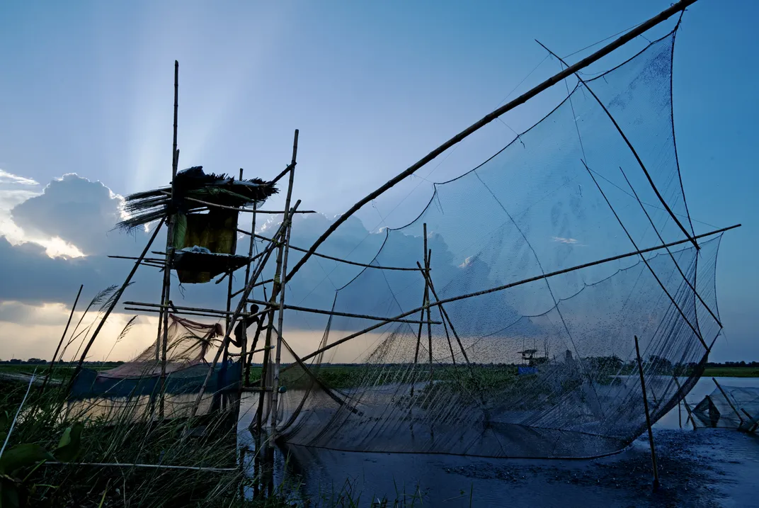 A rural fisherman is pulling his fishing net up from a canal on an afternoon.