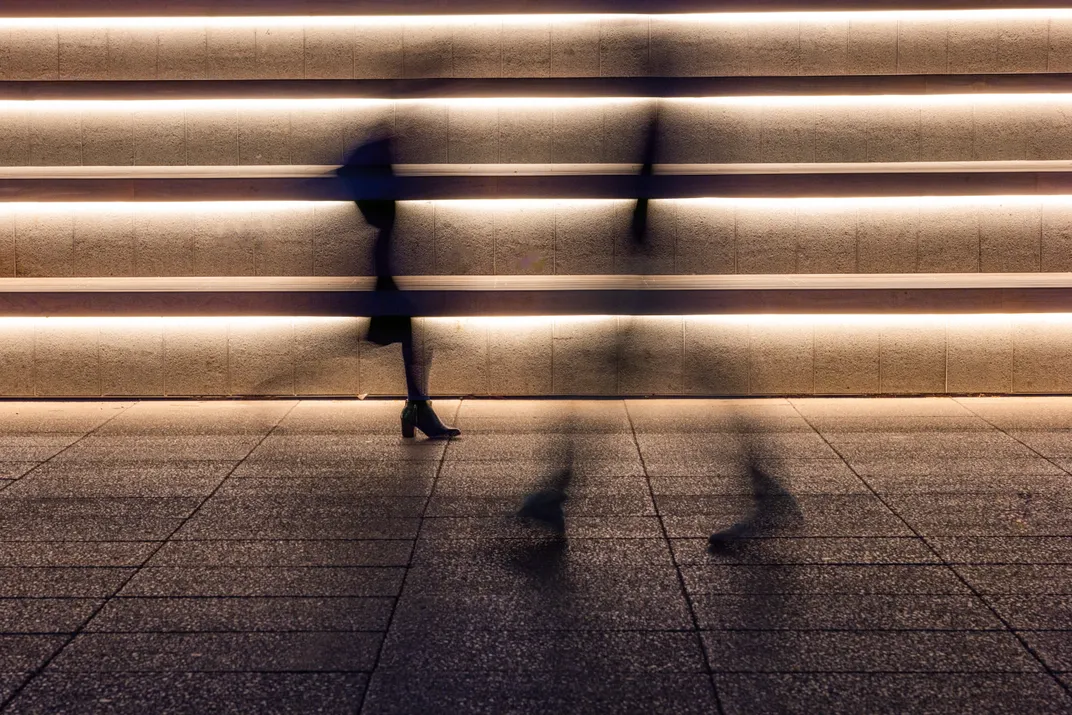 Trails of a man and a woman on their way back home during rush hour in Central London. A fleeting moment evoking sliding doors and life's inevitable missed connections.