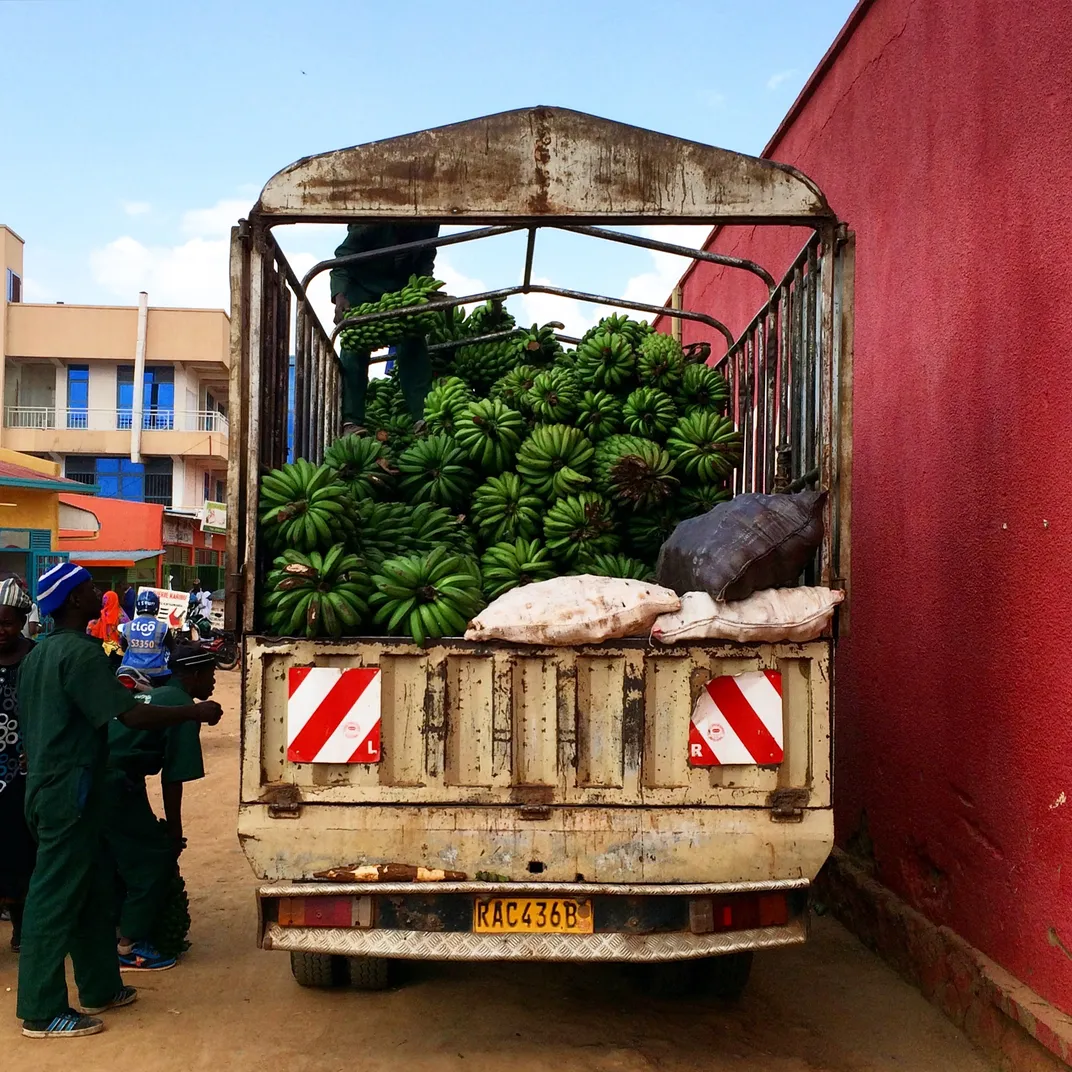 Outside the Kimironko market in Kigali, Rwanda bananas are being unloaded to be sold.