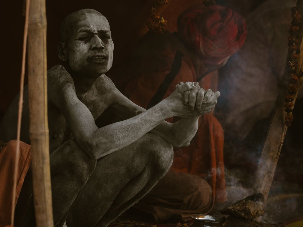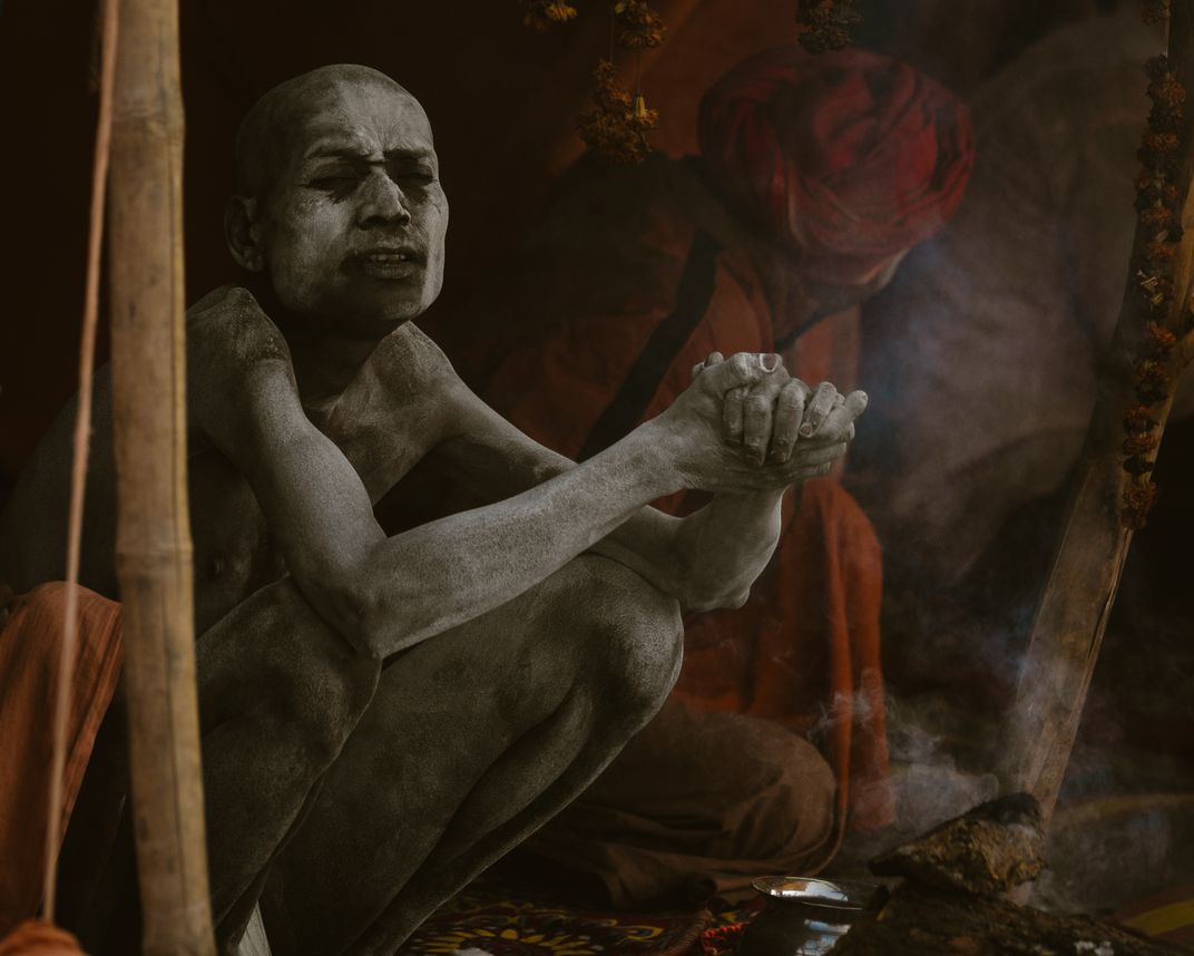 This image captures a Naga sadhu at Kumbh Mela, the largest human gathering in the world. Covered in ash, seated near the sacred fire, and surrounded by symbols of devotion.