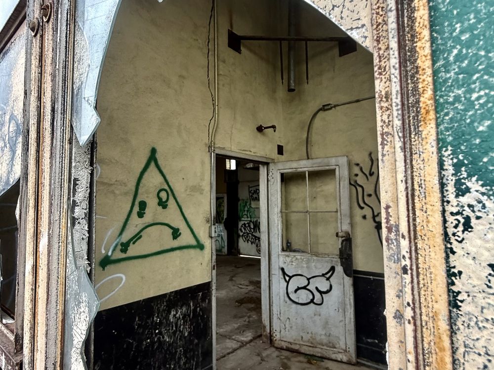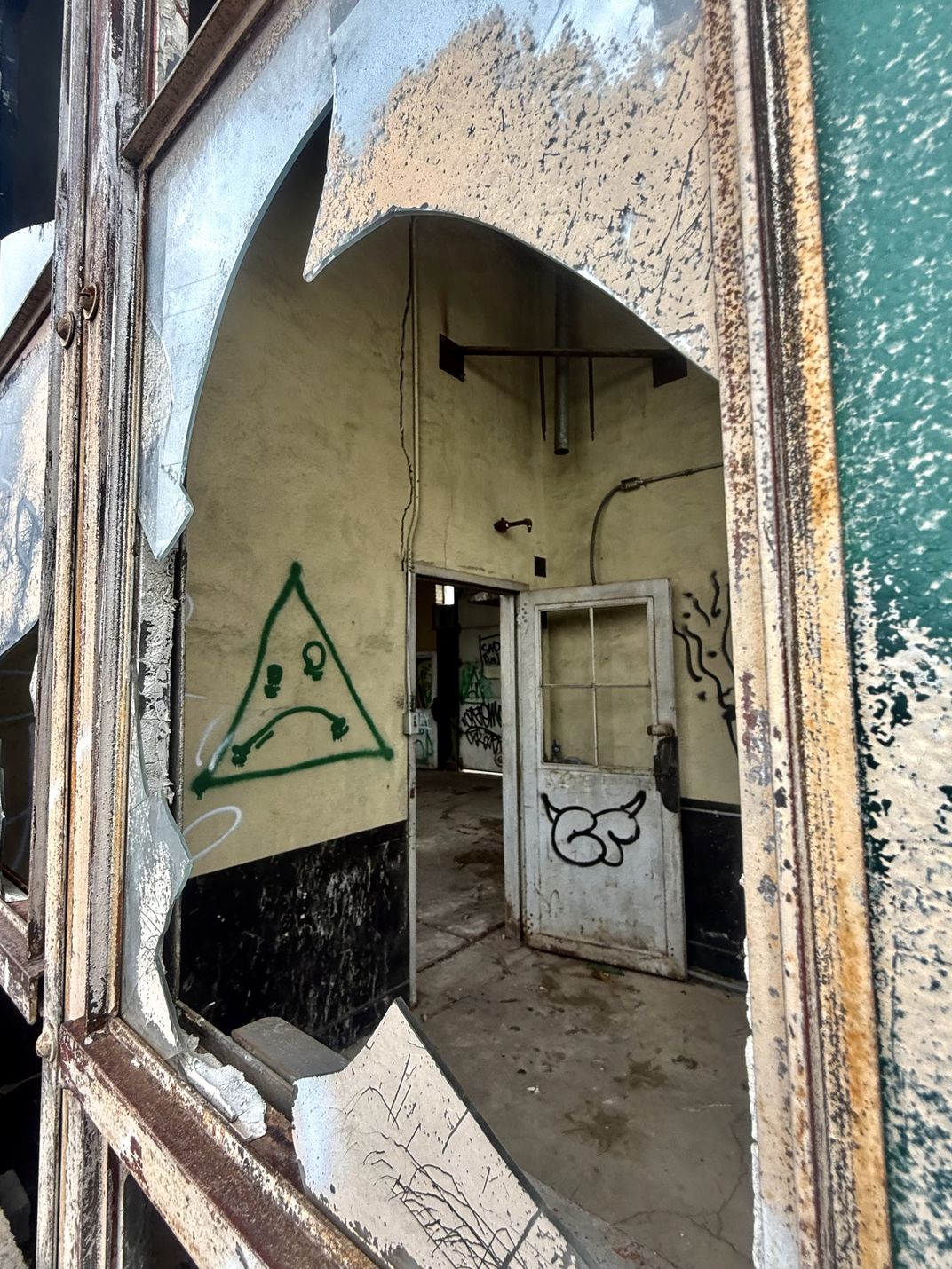 A broken window reveals graffiti on the inside of the railway station in Albuquerque, NM