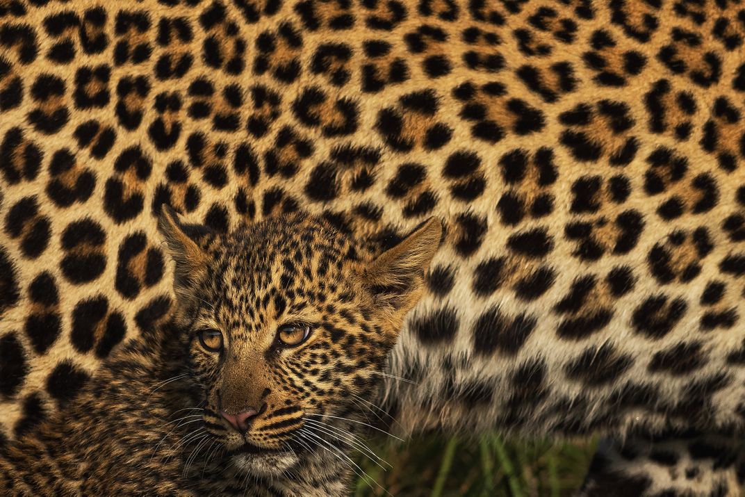 A leopard cub rests against its mother in the Masai Mara, blending into her protective coat. The repeating rosettes frame the cub’s face, symbolizing both camouflage and comfort in a world full of danger.