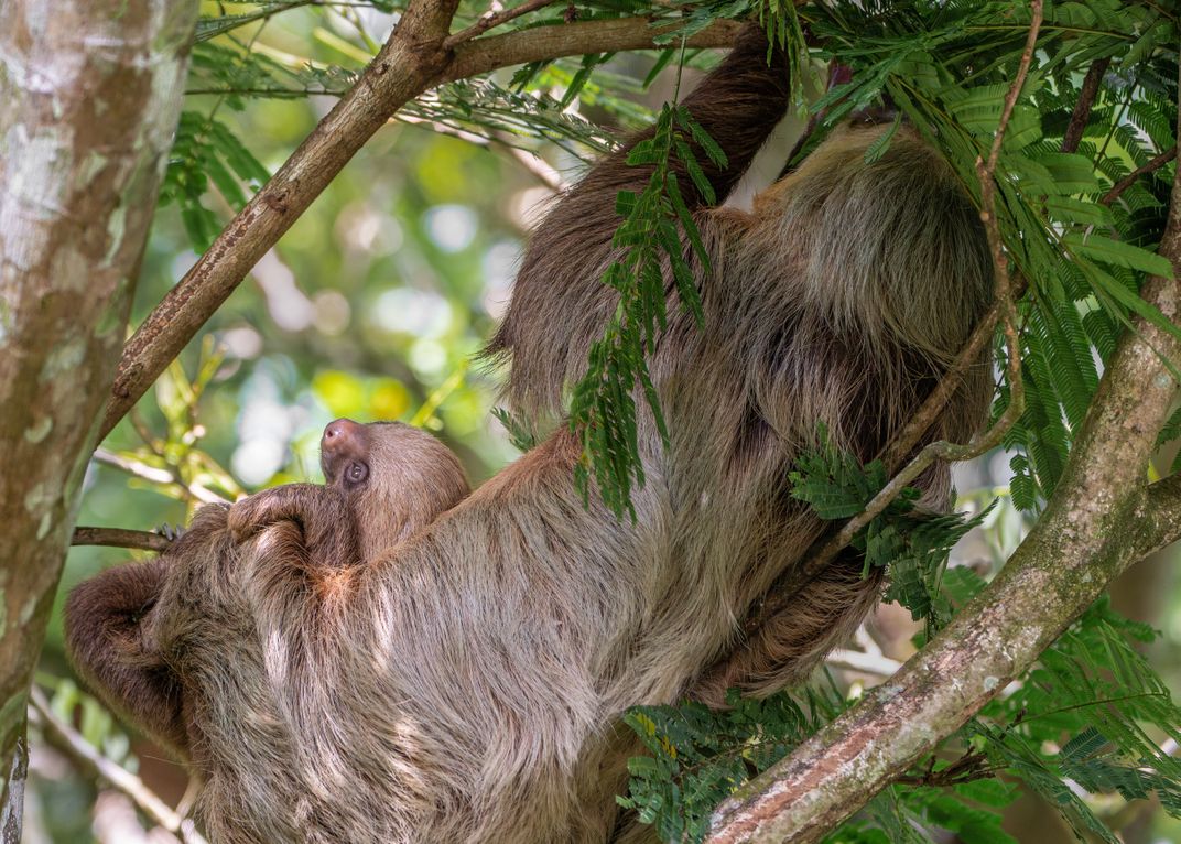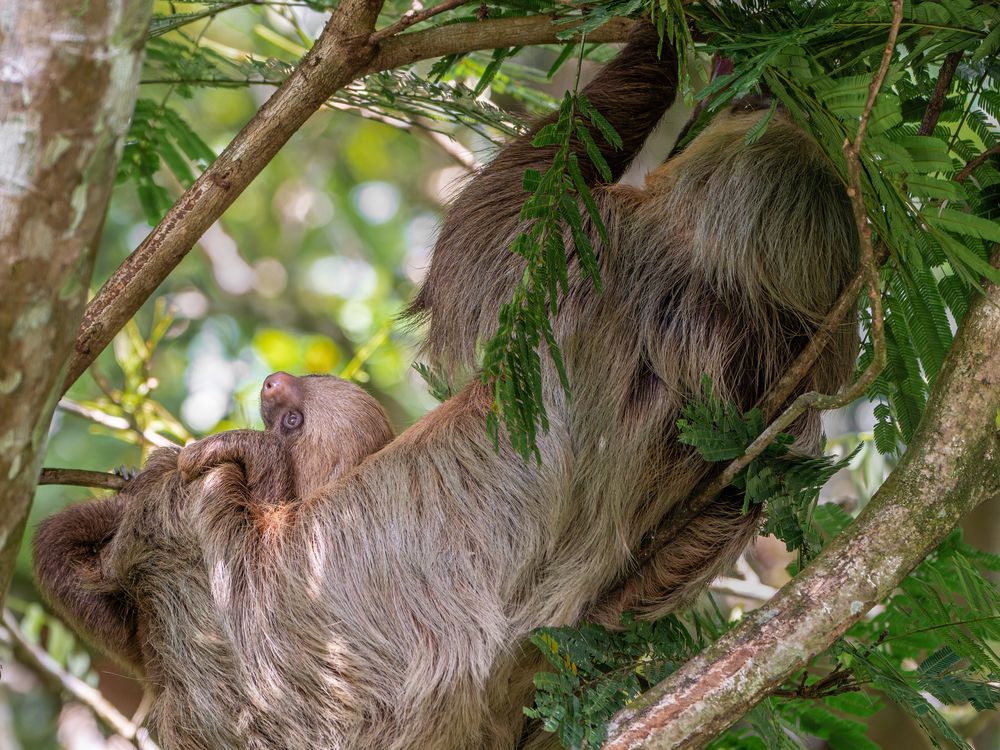 A baby sloth relaxes and gazes contentedly at the world from the safety of its mother’s lap while she gathers food from a tree in Costa Rica. The mother’s face is not visible, but her hair is tidy - it looks freshly brushed and on her head, almost human.