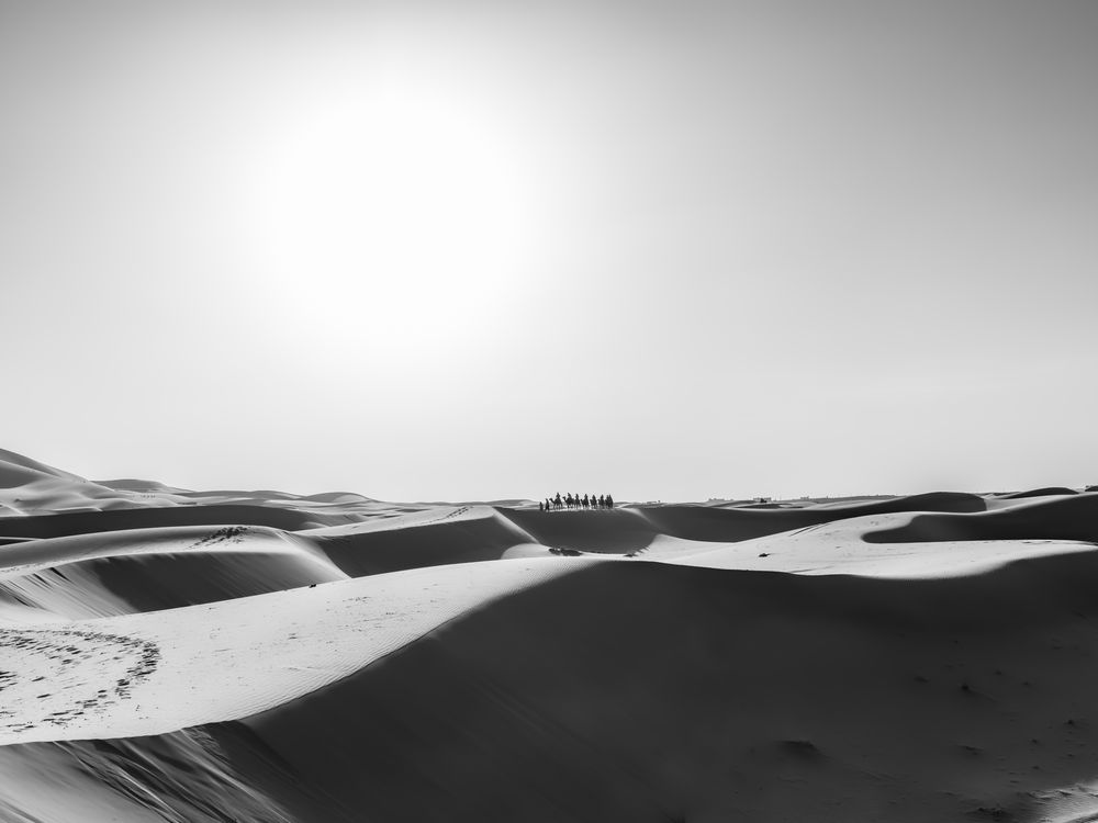 Camels travelling through the Sahara Desert.
