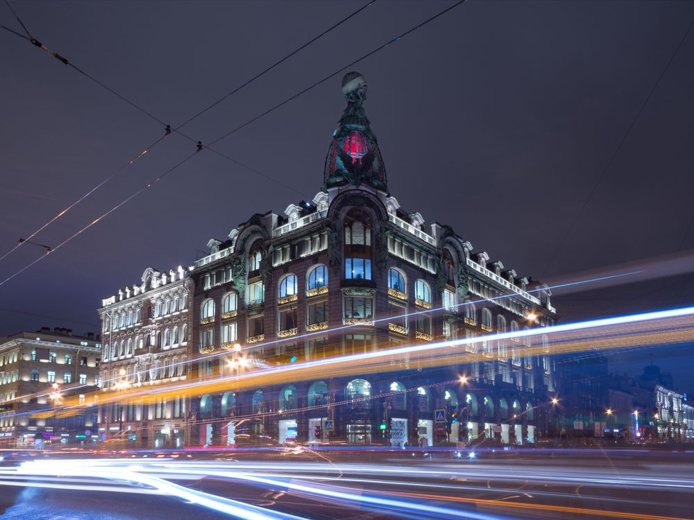 This photo series was taken during the evening rush hour on a weekday. Long exposure turned this ugly hell to magic. Singer Building, Saint Petersburg, Russia.