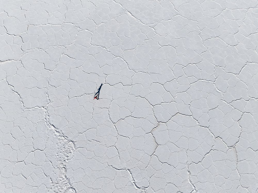 A lone figure in vivid color stands atop the boundless, cracked white surface of the Salar de Uyuni, Bolivia. The geometric salt patterns stretch endlessly, creating a natural mosaic and emphasizing the immense isolation and scale that this world-famous salt flat offers. The aerial view highlights the surreal, pristine landscape—a place that seems to belong to another planet, defined by sharp contrasts and infinite horizons.