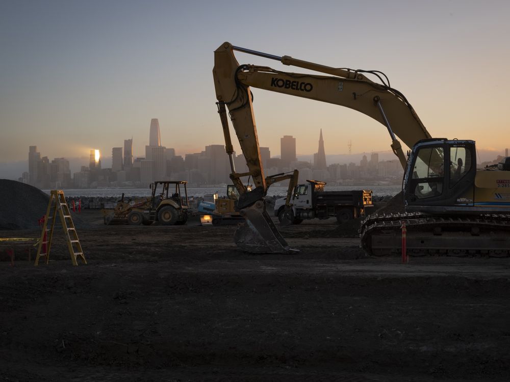 Man-made Treasure Island was created to house the 1939 Golden Gate International Exposition, San Francisco's answer to the New York World's Fair held the same year. After spending decades as a US Navy facility, today it is being redeveloped as "San Francisco's newest neighborhood." In this end-of-day shot, construction equipment on Treasure Island frames San Francisco's skyscrapers, a cityscape perpetually in transition.