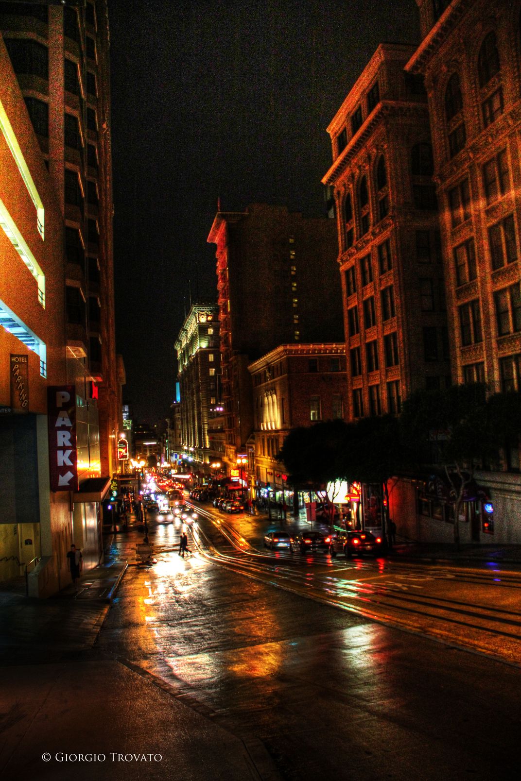 San Francisco street lit up on a wet cold night. Spent the whole day walking around in the rain, but it was sure worth it.