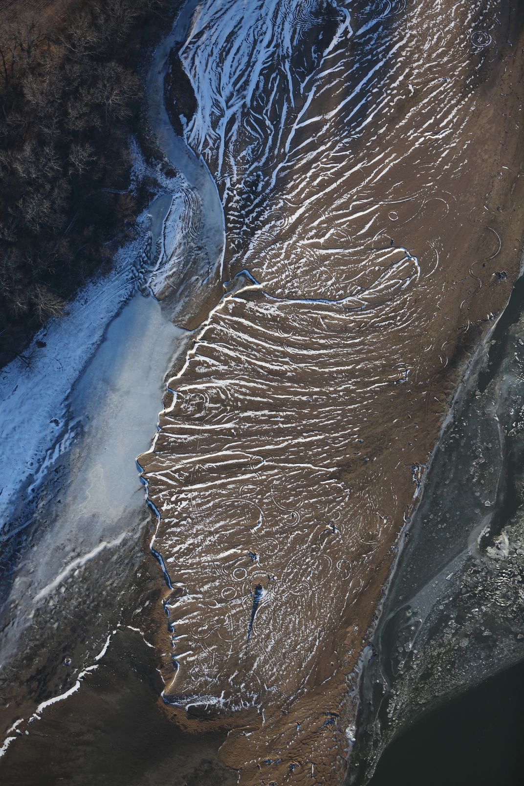 An aerial shot of a sandbar on the Kansas River. Early morning, slanty light rays accentuate textures. Someone has been playing around with an ATV, making circular ruts in the sand.
