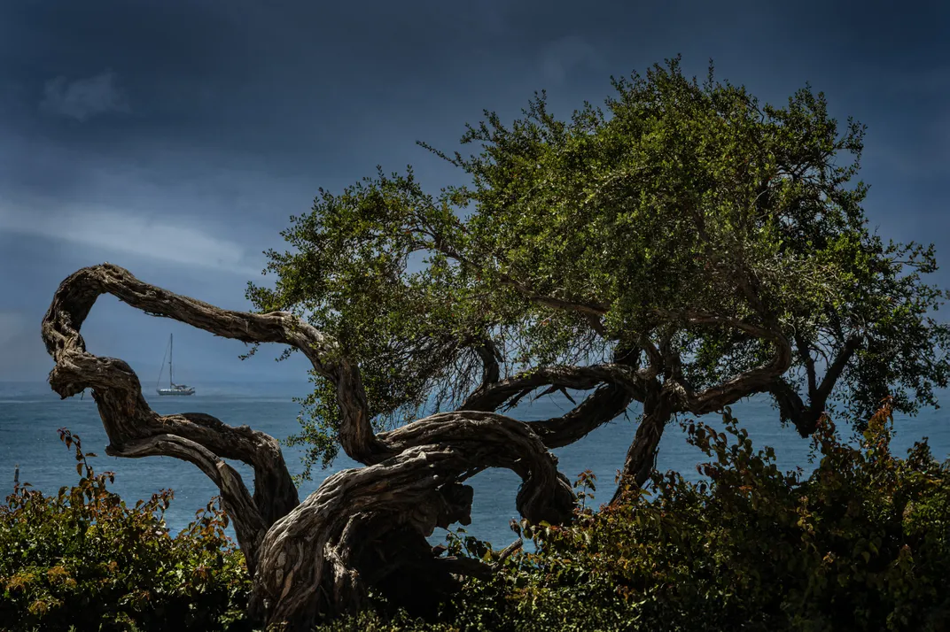 This is an image of a sailboat shot through the frame formed by twisted tree branches.