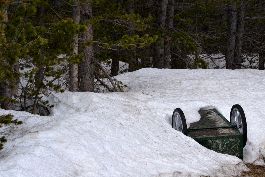 The melting snow uncovered this old wheelbarrow and it caught my attention. I like the fact that is at the edge of the forest and barely visible. I adjusted contrast, color and exposure and I gave it a little bit of oil paint effect in photoshop.