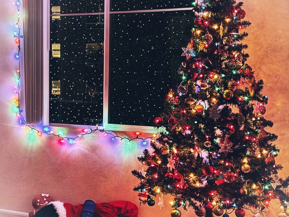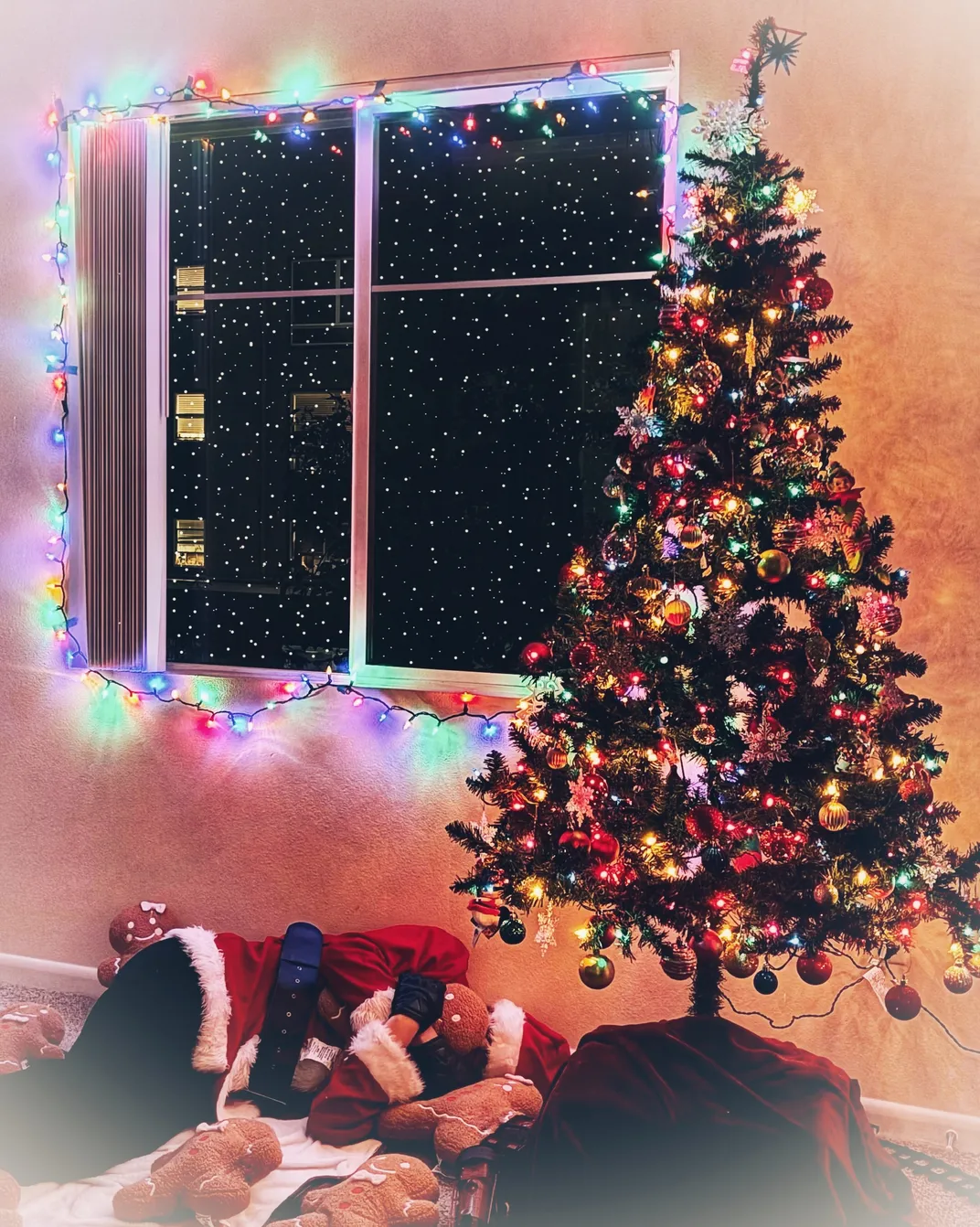 Santa takes a nap with all his favorite gingerbread pillows underneath the Christmas tree while snow falls outside.