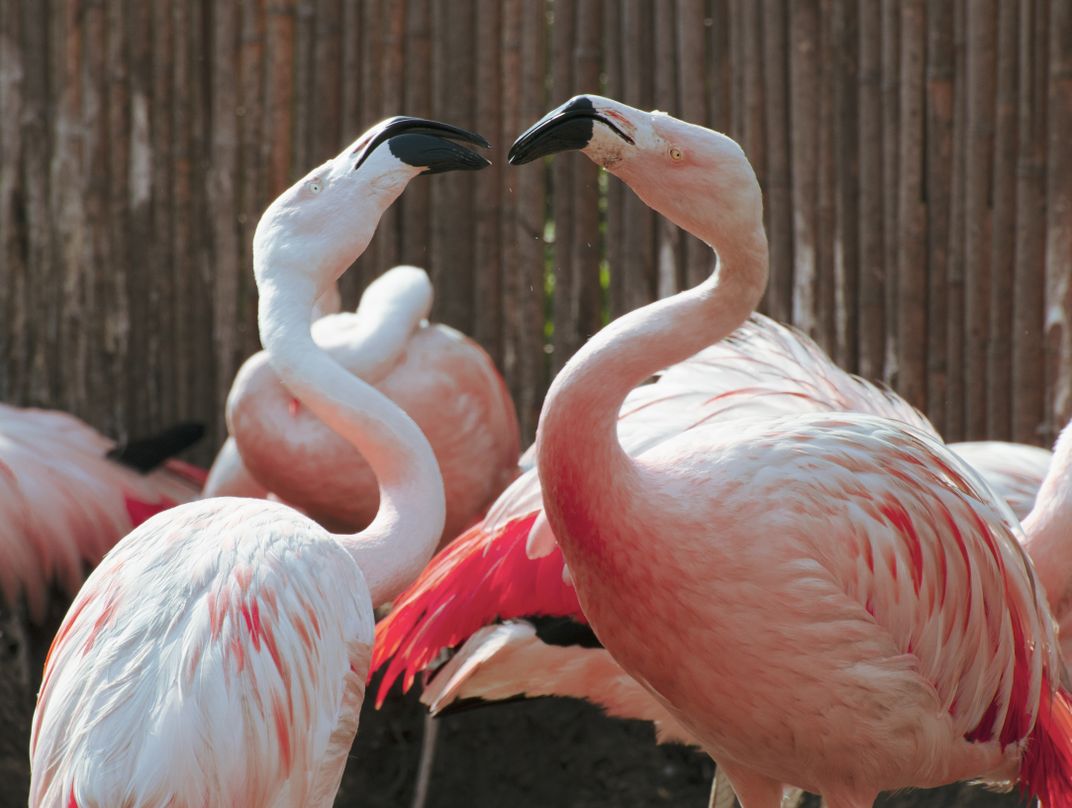 Two Chilean Flamingos engage in a heated conversation.