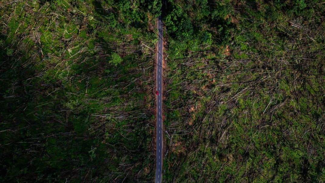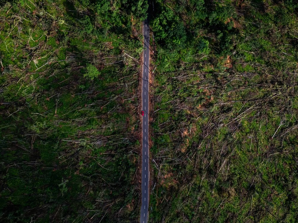 A single road slices through a forest that looks as if nature itself exhaled in fury. From above, the landscape reveals a haunting mosaic of fallen trees snapped, twisted, and scattered in one unified direction. At the center, a lone red vehicle moves forward, a symbol of resilience cutting through the aftermath. This image captures the fragile balance between human presence and the raw, unpredictable power of nature.