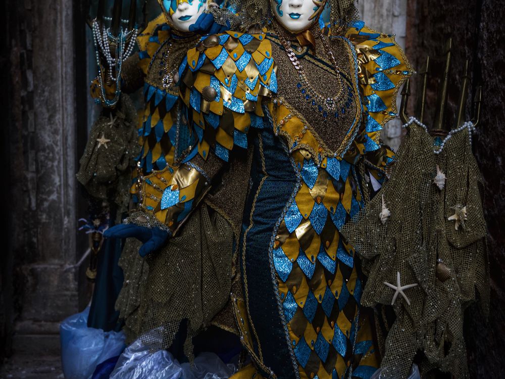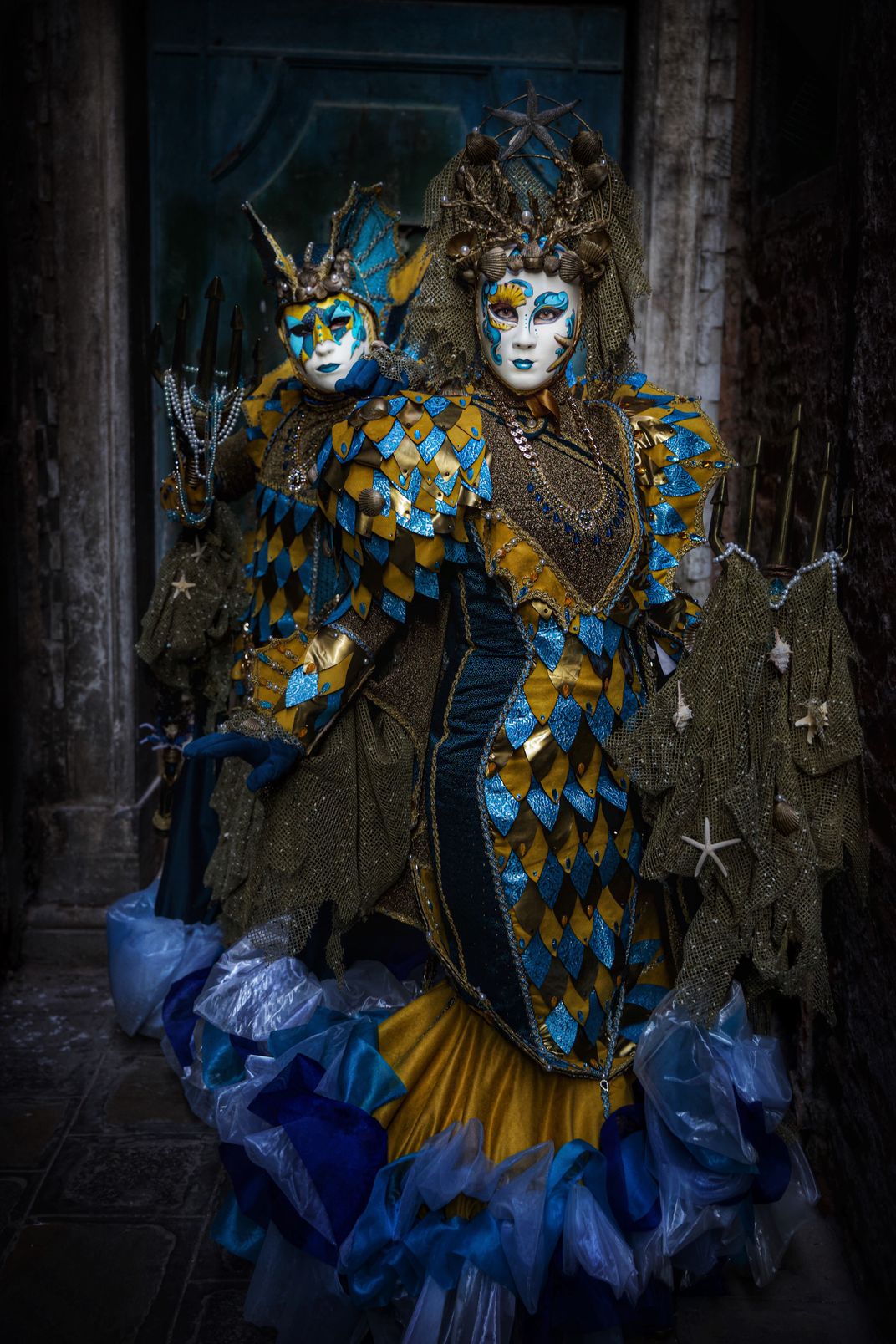 Scena della mitologia marina con tritone e sirena - A scene from marine mythology with triton and mermaid. Day 2 of the Venice Carnevale, I met a beautiful lady calling out to me at San Zaccaria, it’s my old friend Marinella Tormena and her partner Pasquale Giordano… I love sea-themed costumes and these Merfolk are just so beautiful! Merfolks, Mercreatures, Mermen or Merpeople are legendary water-dwelling human-like beings. They are attested in folklore and mythology throughout the ages in various parts of the world. Since Renaissance times, the arts from Venice are already teeming with sea monsters, with the majority being mermen and mermaids. Costume-wise, they are some of my favourite subjects to photograph, especially when they come in blue color. Just look at all the details in the costumes! The scales are made of real leather - an unusual choice for Venetian costumes and there's quite a bit of real seashells on the costumes and props. The creativity of these costumers is just insane. And not too many colors - just 4- Blue, Yellow, Gold and White, which makes it good for fine art photos. This is another of my favourite mask photos this Carnevale!