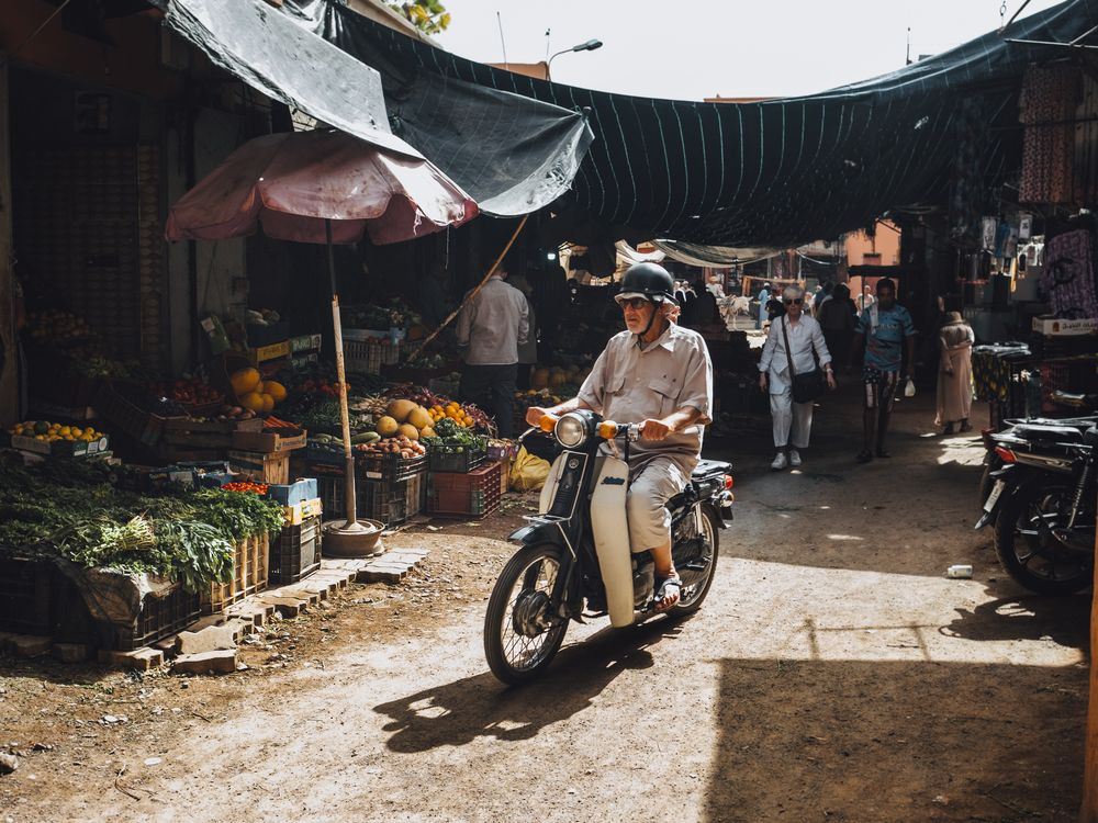 A local rides his scooter through a sunlit alley in Marrakech, weaving past stalls piled with fresh produce as shoppers browse under shaded awnings. Harsh light meets deep shadow, revealing the rhythm of the souks and the daily energy of Morocco.